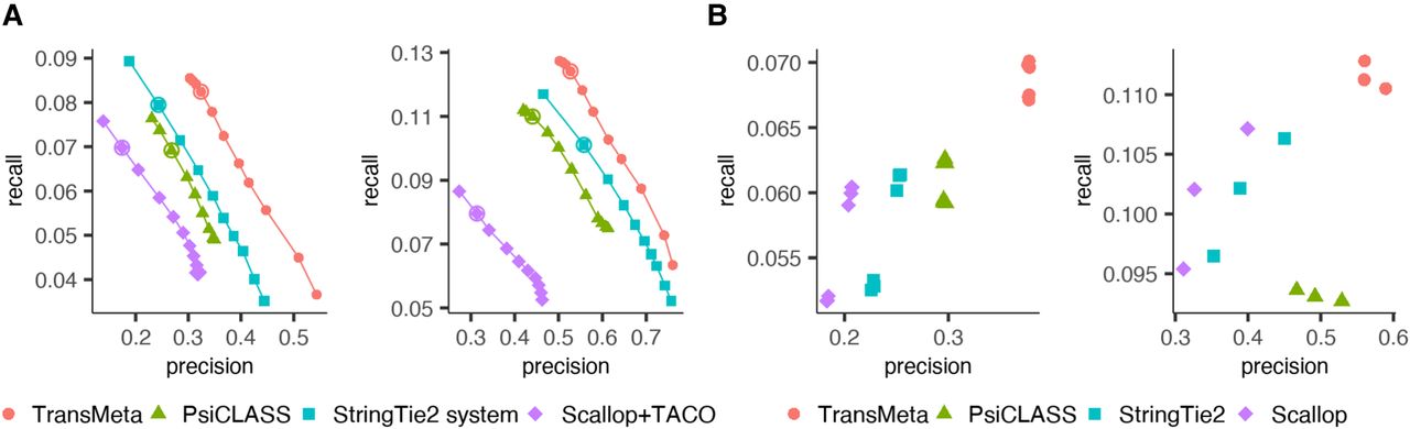 Performance evaluations on the two small-scale data sets R6 and R7 under the HISAT2 alignments. (A) Precision-recall curves of the assemblers. The points on each curve correspond to the filtering thresholds of each assembler; the circled one, to the default value. (B) The precisions and recalls of the assemblers on different samples at the individual sample level under their default settings. Different colors correspond to different assemblers, and each point corresponds to a specific sample.