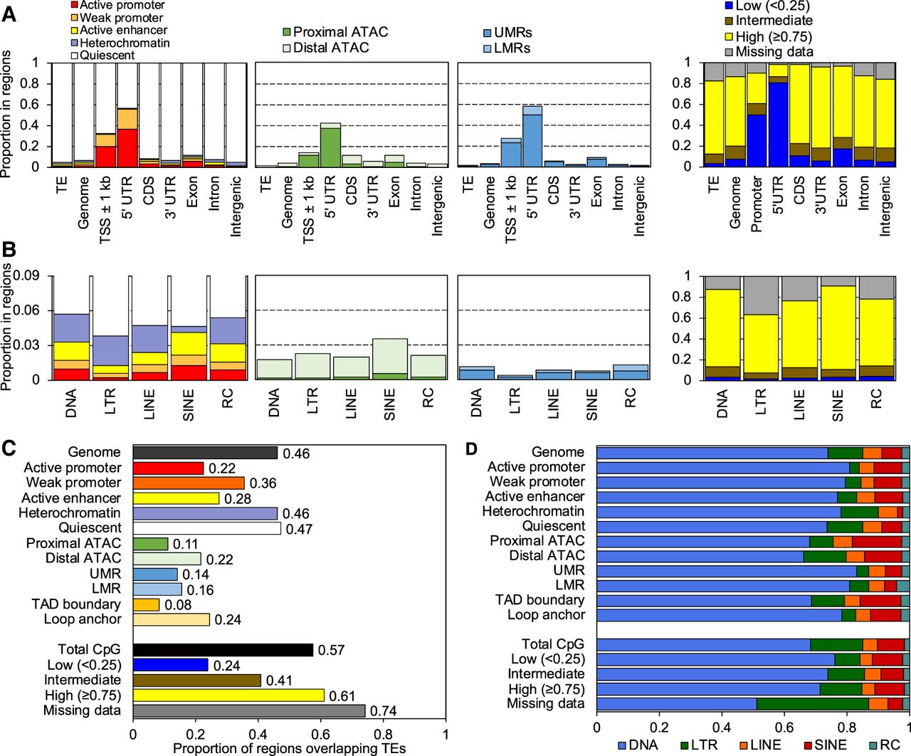 Substantial contribution of TEs to zebrafish CREs. (A) The proportion of bases within TEs, the entire genome, and Ensembl genic features annotated with each chromatin state (leftmost), ATAC-seq peak (mid-left), UMR or LMR (mid-right), and proportion of CpGs annotated with methylation state (rightmost), summed across all tissues with data for each category. (TSS) Transcription start site, (UTR) untranslated region, (CDS) coding sequences. (B) The proportion of bases within each TE class annotated by epigenetic state, summed across all tissues with data for each category. The color legend is the same as in A. (C) The total proportion of epigenetic states within TEs across all tissues versus the total proportion of all genomic bases and CpGs within TEs (black bars). (D) The proportion of each bar in C by TE class.