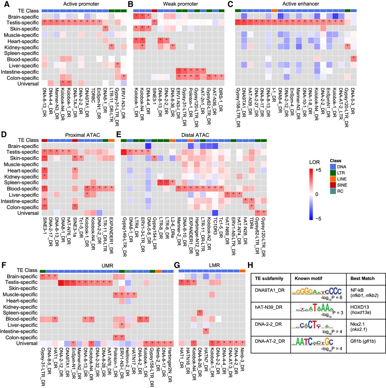 Heat map of tissue-specific enrichment of TE subfamilies in epigenetic states. (A) Active promoter. (B) Weak promoter. (C) Active enhancer. (D) Proximal ATAC-seq peaks. (E) Distal ATAC-seq peaks. (F) UMRs. (G) LMRs. (LOR) Log odds ratio, (*) FDR < 0.05 from permutation test with Benjamini–Hotchberg multiple testing corrections. (H) Known motifs of TE subfamilies enriched in testis-specific enhancer regions.