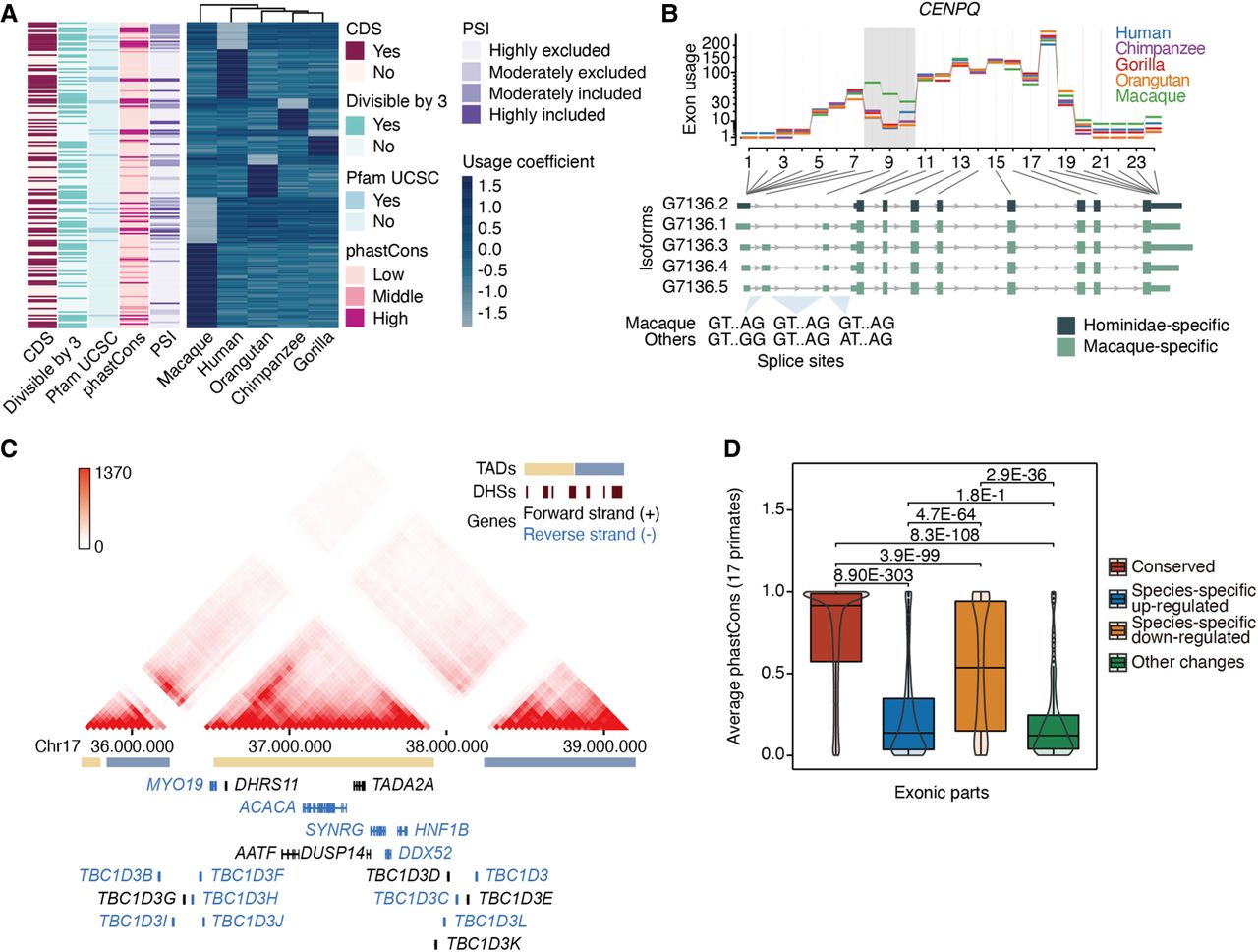 Exon usage dynamics across primates. (A) Usage coefficients for skipping exons displaying species-specific changes (row-wise scaled). Overlap with coding sequence (CDS) and Pfam protein domains (UCSC), divisibility by three, average percentage-splice-in (PSI), and average phastCons scores are shown for each exon (see Supplemental Methods). (B) Example of gene (CENPQ) with different splice sites in macaque and great apes. Exon usage coefficients are illustrated at the top. Hominidae- and macaque-specific Iso-Seq transcripts are color-coded (bottom). (C) Chr17q12 region with high density of human-specific DEU. Hi-C interaction intensity is indicated in the color legend. Gene orientation, DNase hypersensitive sites (DHSs), and topologically associating domains (TADs) are also displayed. (D) Average conservation score in primates for exonic parts with conserved usage (N = 95,453), species-specific up-regulation (N = 941) or down-regulation (N = 1340), and exonic parts showing other usage changes (N = 277). “Other changes” correspond to usage differences between groups of species (e.g., any two species show differential usage vs. the remaining three species). Exonic parts longer than five bases (all included as passed in 1000 Genomes hg38 strict mask) are shown. Statistical significance of the difference across groups was assessed by the Wilcoxon test, and shown P-values are adjusted by the Holm method.