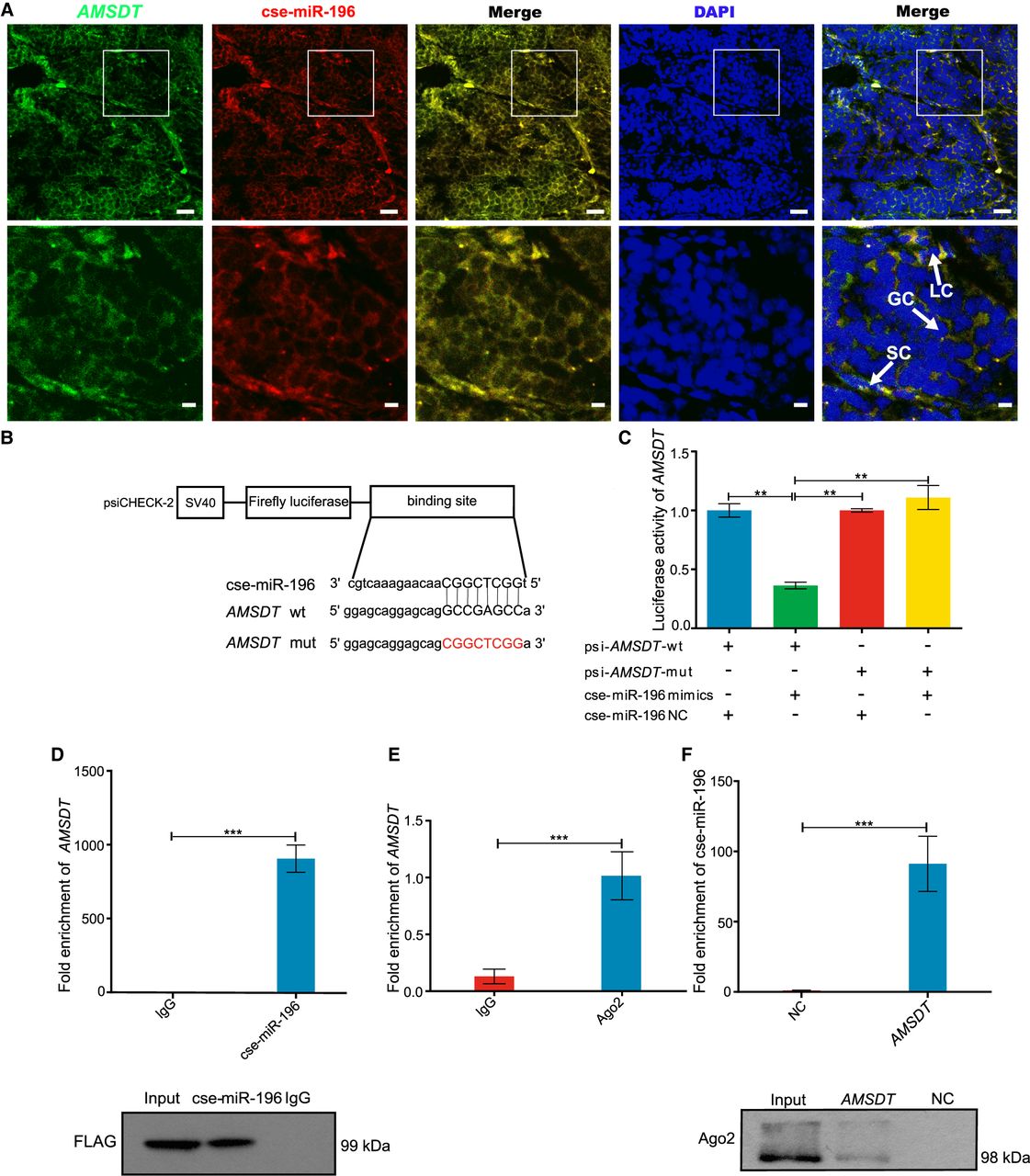AMSDT physically associates with cse-miR-196. (A) Representative images of confocal micrographs of the subcellular localization and expression of AMSDT (green) and cse-miR-196 (red) in tongue sole testis. Nuclei were counterstained with DAPI (blue). The bottom row shows enlargement of the regions outlined in the top row. Scale bars in top rows are 20 μm, and bars in bottom rows are 5 μm. (B) Putative binding sites of cse-miR-196 on AMSDT. (C) Luciferase activity of AMSDT in HEK293T cells transfected with cse-miR-196 mimics. Luciferase activity was normalized to Renilla luciferase activity of AMSDT. (D) Ago2 immunoprecipitation executed in HEK293T cells that are stably expressing Ago2 (tongue sole), AMSDT, and cse-miR-196, followed by western blot and qRT-PCR to detect AMSDT (top) and Ago2 protein (bottom), respectively. (E) Ago2 immunoprecipitation was executed in tongue sole testis, followed by qRT-PCR to detect AMSDT. (F) RNA pull-down of tongue sole testis lysates, followed by qRT-PCR and western blot to detect the enrichment of cse-miR-196 and Ago2 protein. The NC and AMSDT in the figure represent the AMSDT-mut and AMSDT-wt probe captured fraction group, respectively. The bars in C–F represent triplicate mean ± SD values from three biological replicates. (n = 3.) (∗∗) P < 0.01, (∗∗∗) P < 0.001, two-tailed t-test.