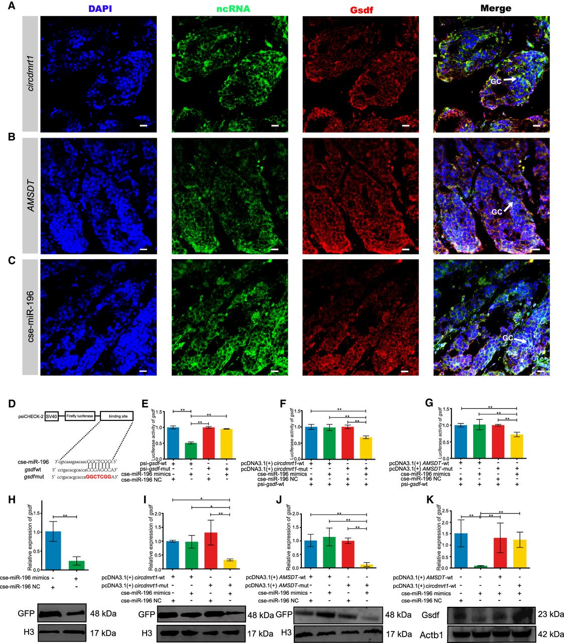 circdmrt1 and AMSDT relieve the repressive effect of cse-miR-196 on gsdf mRNA and protein. (A) Representative images of confocal micrographs of tongue sole testis stained with anti-Gsdf antibody (red), circdmrt1 probe (green), and DAPI (blue). Scale bars represent 10 μm. (B) Representative images of confocal micrographs of tongue sole testis stained with anti-Gsdf antibody (red), AMSDT probe (green), and DAPI (blue). Scale bars represent 10 μm. (C) Representative images of confocal micrographs of tongue sole testis stained with anti-Gsdf antibody (red), cse-miR-196 probe (green), and DAPI (blue). Scale bars represent 10 μm. (D) Putative binding sites of cse-miR-196 on gsdf. (E) Luciferase activity of gsdf-5′-UTR in HEK293T cells transfected with cse-miR-196 mimics. Luciferase activity was normalized to Renilla luciferase activity from HEK293T cell lysate. (F) Luciferase reporter activity of gsdf-5′-UTR in peripheral blood cells of tongue sole with circdmrt1 overexpression. (G) Luciferase reporter activity of gsdf-5′-UTR in peripheral blood cells of tongue sole with AMSDT overexpression. (H) The mRNA and protein levels of gsdf in peripheral blood cells of tongue sole with overexpression of cse-miR-196. (I) The mRNA and protein levels of gsdf in peripheral blood cells of tongue sole with overexpression of circdmrt1. (J) The mRNA and protein levels of gsdf in peripheral blood cells of tongue sole with overexpression of AMSDT. (K) gsdf expression in tongue sole testis transfected with cse-miR-196 mimics alone or cotransfected with circdmrt1 and AMSDT. The transcription levels were normalized to 18S rRNA and Actb1 levels. Data are representative of three independent experiments. Error bars, ±SD. (*) P < 0.05, (**) P < 0.01, two-tailed t-test.