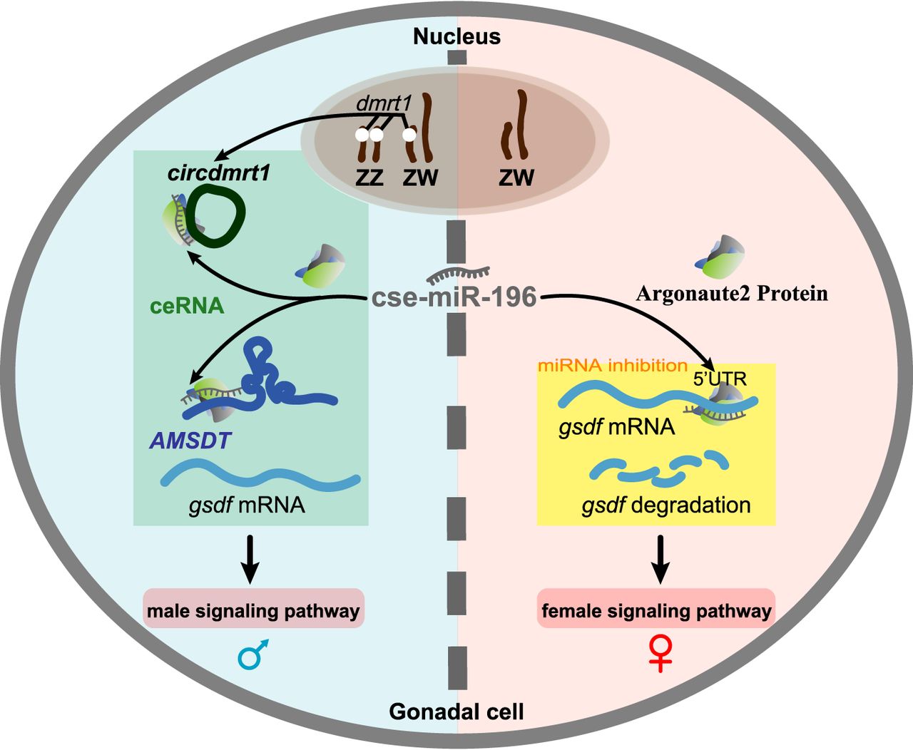 Diagram illustrating the hypothetical mechanism of ceRNA crosstalk during sex determination and differentiation in tongue sole. In genotypic males, AMSDT and circdmrt1 display a higher testis-specific expression during the critical stage of sex differentiation and could act as miRNA cse-miR-196 sponges to increase the expression of gsdf. Thus, the expression of female-related genes is inhibited by the up-regulation of gsdf mediated through ceRNA, hence triggering male development (left side). Conversely, the expression of AMSDT and circdmrt1 are low in ovary. Therefore, the expression of cse-miR-196 is much higher in the ovary than in testis, which results in down-regulation of gsdf in the ovary (right side). The expression of female-related genes should not be hampered due to the absence of gsdf. On the male side, the ZW pair and ZZ pair represent ZW pseudomales and ZZ males, respectively. On the female side, the ZW pair represents ZW females.