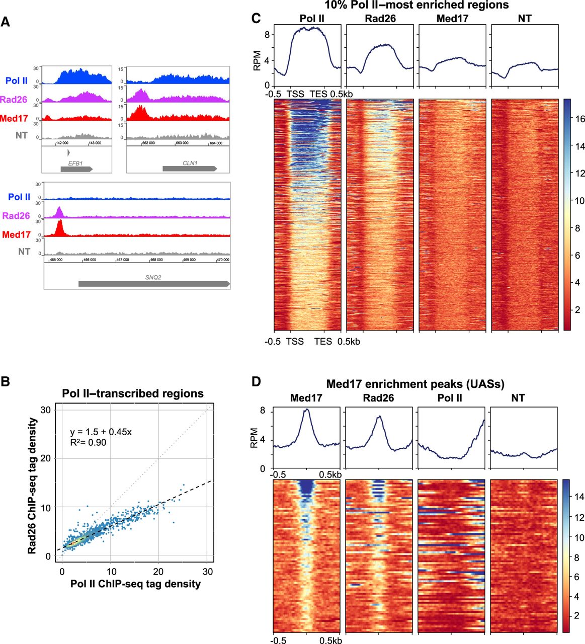 Genome-wide analysis of Rad26 occupancy. (A) Examples of Rad26, Pol II, and Mediator (Med17) tag density profiles in the wild-type (WT) context on Pol II–transcribed genes. Nontagged (NT) control is also included. (B) Rad26 ChIP-seq density versus Pol II ChIP-seq density on Pol II–transcribed genes. Each point on the plot corresponds to one transcribed region. A linear regression (dotted line) and an R2 linear regression coefficient are indicated. The dashed line corresponds to y = x. (C) Heat maps of Pol II, Rad26, and Mediator (Med17) ChIP-seq occupancy on the 10% Pol II–most enriched regions (scaled windows for 500 bp before TSS, between TSS and TES, and 500 bp after TES), sorted by decreasing Pol II occupancy. Median tag density profiles in reads per million (RPM) are shown in upper panels. NT control is also displayed. (D) Heat maps of Mediator (Med17), Rad26, and Pol II ChIP-seq occupancy centered on Mediator enrichment peaks (−500 bp to +500 bp; UASs), sorted by decreasing Mediator occupancy. Median tag density profiles in RPM are shown in upper panels. NT control is also displayed.