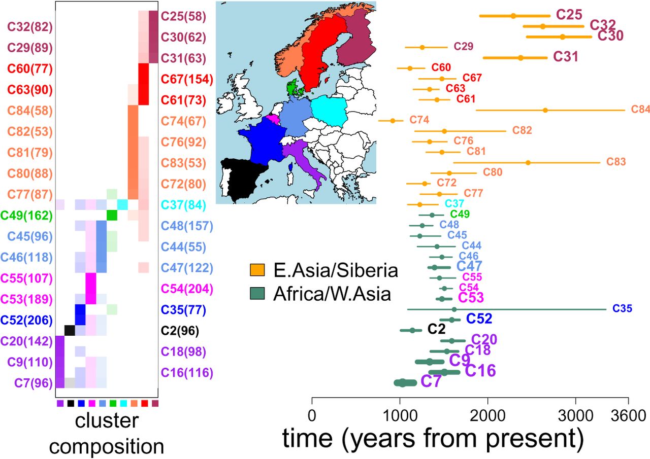 Inferred admixture events in 36 European clusters. (Right) Inferred admixture dates (+95% CIs) for the 36 European clusters that contain more than 50 individuals, have a single inferred date, and have a >2% inferred contribution from reference groups in East Asia/Siberia (orange CIs) or in Africa/West Asia (teal CIs). The thickness of the lines indicates the relative inferred contributions from these two regions: “Africa/W. Asia” = {West Africa, West Asia, South Middle East, North Africa, San, Central Africa, East Africa, Bantu, Ethiopian} and “E. Asia/Siberia” = {Siberia, Northeast Asia, Southeast Asia} as defined in Supplemental Table S4. (Left) The proportion of individuals in each cluster (row) from each country (column), with the clusters’ sample sizes in parentheses and the countries’ colors in the map. Each cluster's label at left and at right is colored according to the country most represented in that cluster.