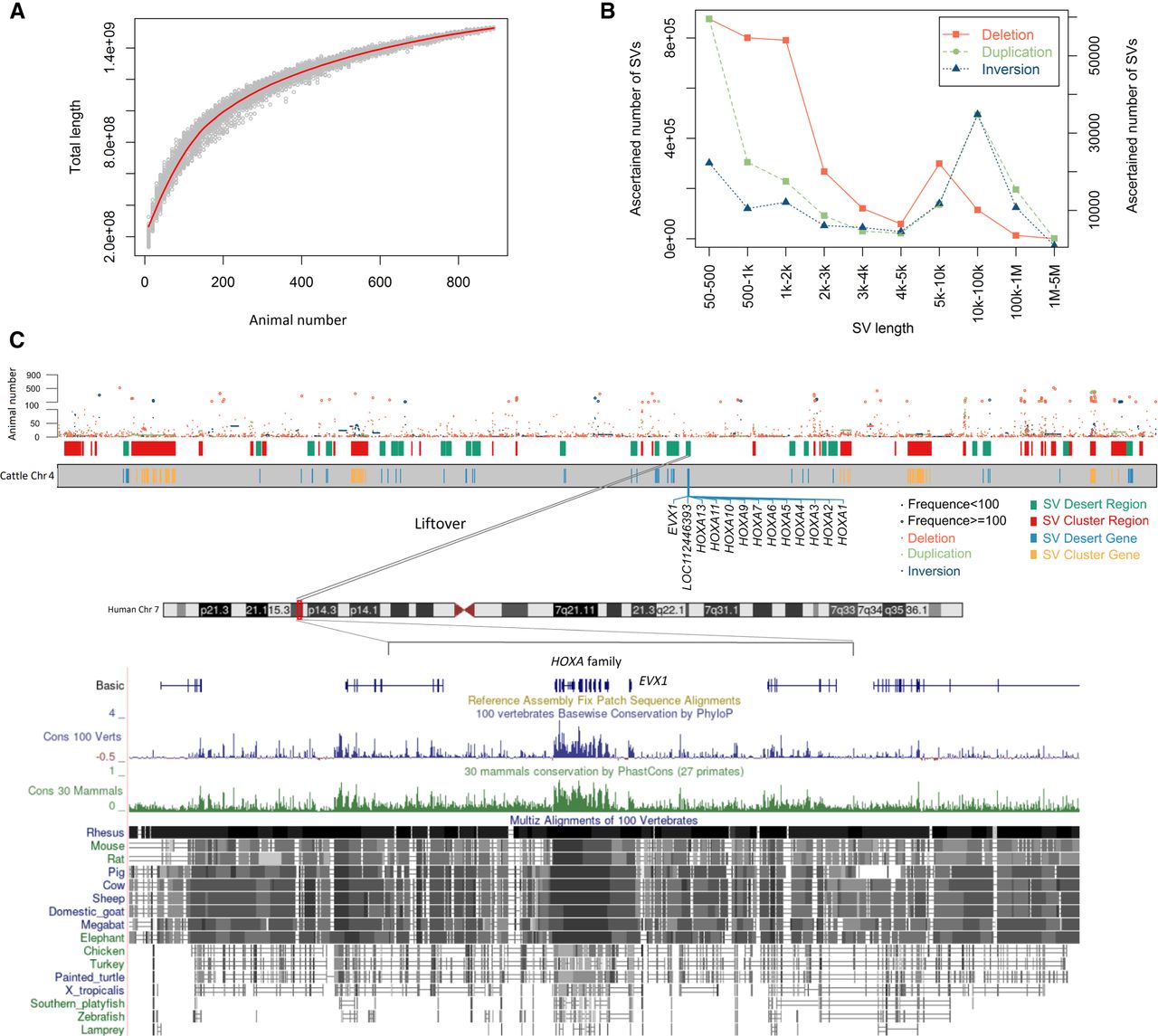 Statistics and chromosomal distribution of structural variations (SVs) in 898 cattle. (A) Simulations of the increase in SV number detected with the increase of animal number. No more substantial SV increase when the animal number is over 800, indicating that selected cattle were sufficient to capture the majority of bovine SV. The red line is the fit curve of data points in light green. (B) SV density of different sizes for each SV type; the left y-axis is for the deletion, and the right y-axis is for duplication and inversion. (C) SV distribution on cattle Chromosome 4 near the HOXA locus. (SV Desert Gene) Genes located in the SV desert region; (SV Cluster Gene) genes located in the SV cluster region.