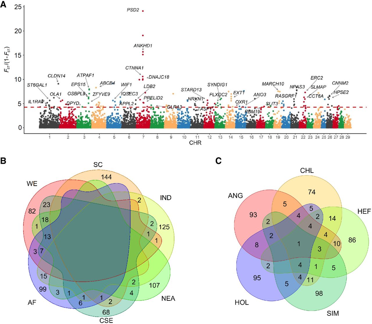 Selection signature analysis of different cattle populations and breeds. (A) FST analysis between B. taurus and B. indicus. (B) Venn diagram for shared versus population-specific selection events among six cattle populations of different geographic origins. (C) Venn diagram for shared versus breed-specific selection events among five widely used European commercial cattle breeds. (WE) West Europe, (CSE) Central-South Europe, (NEA) Northeast Asia, (NWC) Northwest China, (NCC) North-Central China, (SC) South China, (INA) India, (AF) Africa; (ANG) Angus, (CHL) Charolais, (HEF) Hereford, (SIM) Simmental, (HOL) Holstein.
