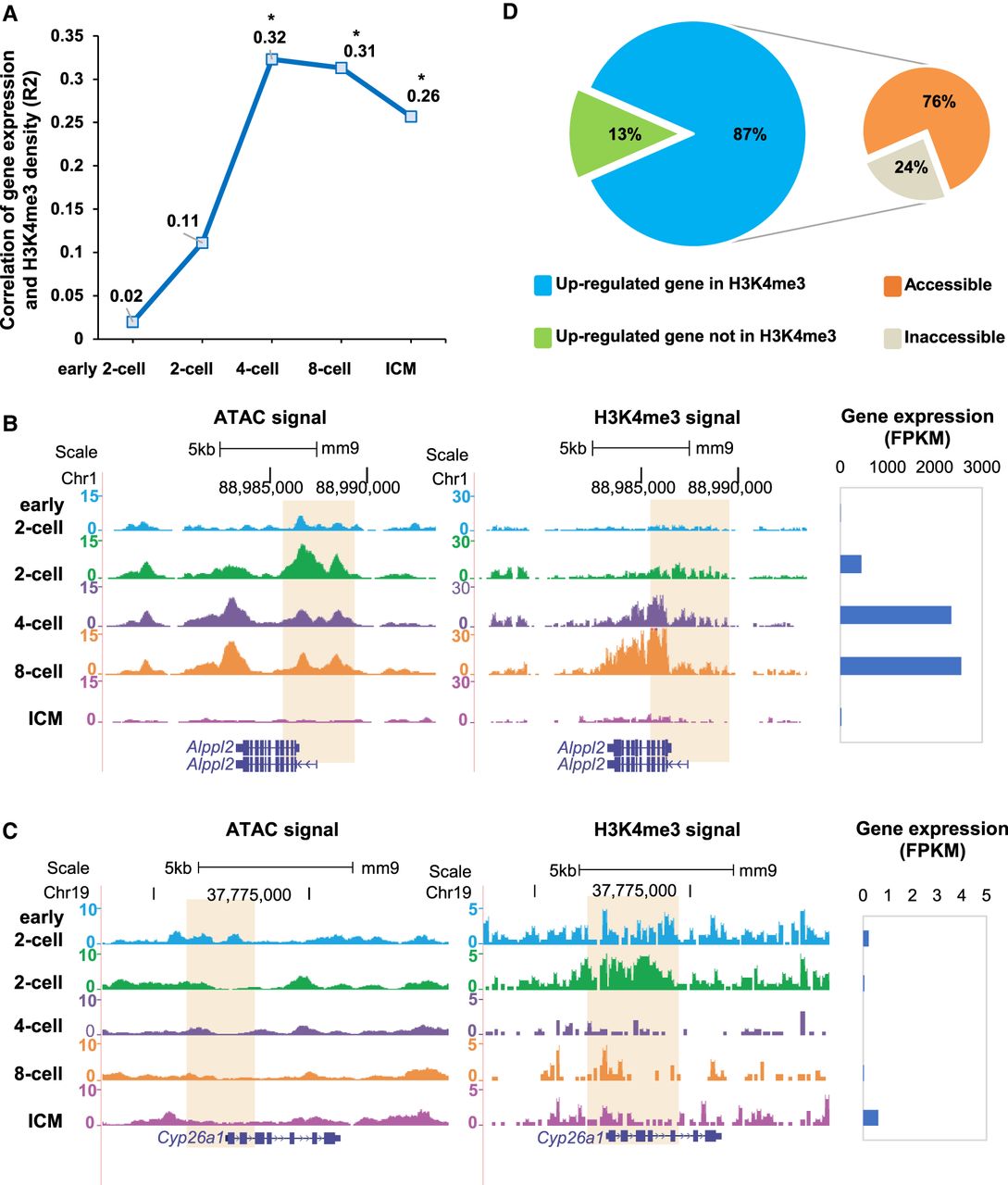 H3K4me3 facilitates gene up-regulation in the four-cell stage. (A) Correlations between gene expression (GSE66582) and H3K4me3 (GSE71434) signal levels in promoters (2 kb upstream of TSSs) of ZGA-only genes. Correlation coefficients (R2 values) were calculated by Pearson's linear correlation. (*) 1 × 10−5< P < 1 × 10−10. (B) UCSC plots show chromatin accessibility (GSE66581) and H3K4me3 (GSE71434) signal surrounding gene Alppl2. Bar plot shows the expression level of gene Alppl2. (C) UCSC plots show chromatin accessibility (GSE66581) and H3K4me3 (GSE71434) signal surrounding gene Cyp26a1. Bar plot shows the expression level of gene Cyp26a1. (D) Pie charts show the percentage of up-regulated genes with and without H3K4me3 (GSE71434) peaks in the promoter (left) and chromatin accessibility of up-regulated genes that are targeted by H3K4me3 (GSE71434) peaks in the promoter (right).