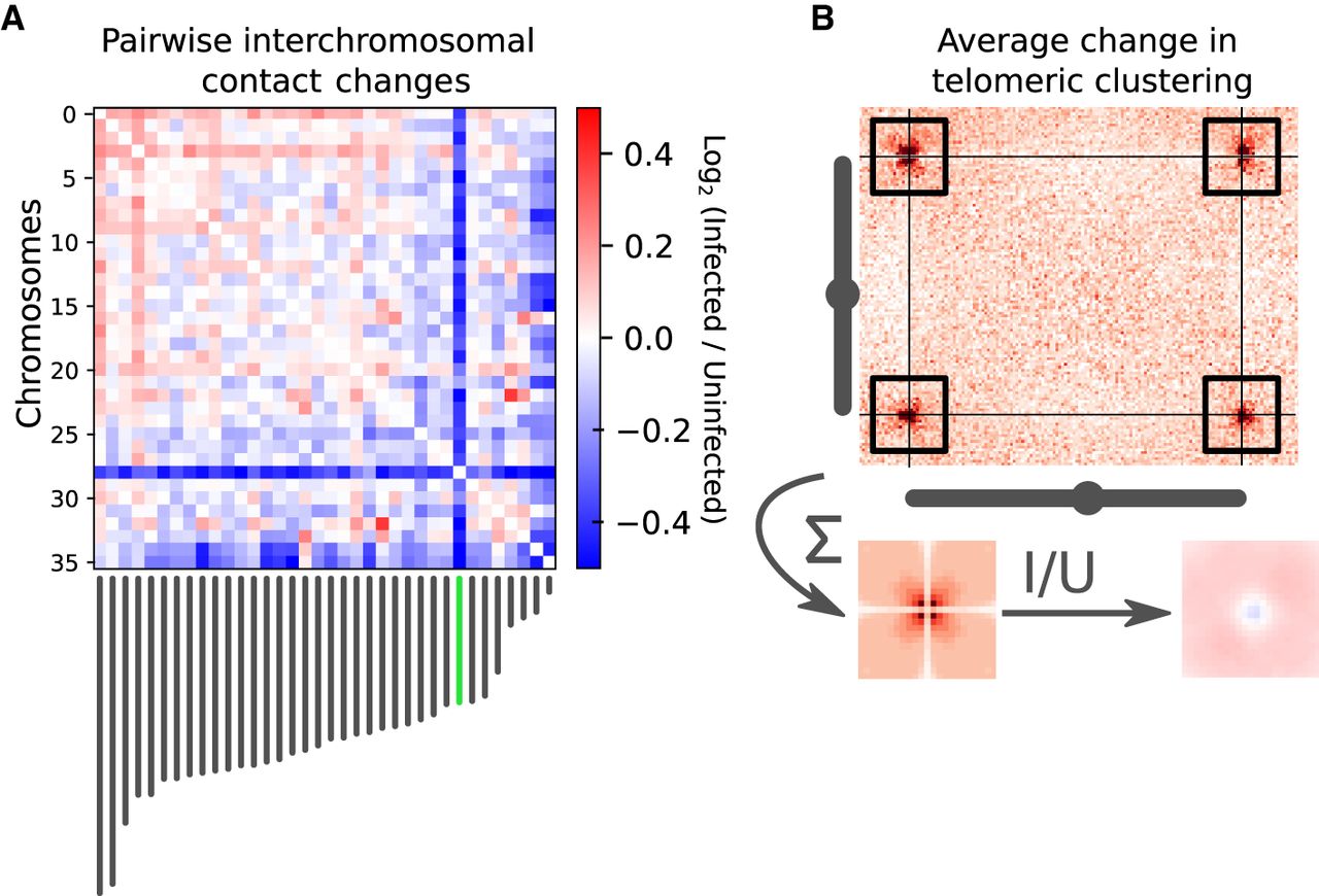 Changes in trans-chromosomal contacts between A. castellanii chromosomes following L. pneumophila infection. (A) Average contact change during infection between each pair of chromosomes. Chromosome lengths are shown below the interaction matrix, with the chromosome bearing 18S and 28S rDNA highlighted in green. (B) Representative intertelomeric contacts between a pair of chromosomes (C3 scaffolds 3 and 11). The average intertelomeric contact profile generated from all pairs of chromosomes is shown as a pileup. The log ratio between the infected (I) and uninfected (U) profiles is shown as a ratio (right).