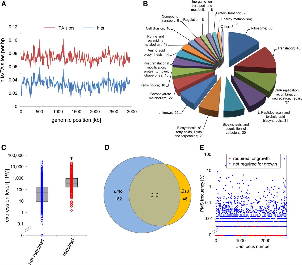 Identification of L. monocytogenes genes required for growth in BHI broth by Tn-Seq. (A) Distribution of TA sites and Tn insertion sites along the L. monocytogenes EGD-e genome. TA sites/hits per base pair were calculated using a coverage window of 10,000 bp. (B) Functional classes of the 394 L. monocytogenes EGD-e genes that are required for growth in BHI broth at 37°C according to Tn-Seq. (C) Expression levels of the 394 genes required for growth in comparison to all other L. monocytogenes EGD-e genes according to a previously published RNA-seq experiment also performed under standard growth conditions (Hauf et al. 2019). The asterisk indicates statistical significance (t-test, P < 0.0001). (D) Venn diagram illustrating the intersection between the 394 L. monocytogenes genes required for growth and the essential genes of B. subtilis 168 (n = 258). (E) Frequency of naturally occurring premature stop codons (PMSs) in each of the L. monocytogenes EGD-e genes as observed in a data set of 27,118 L. monocytogenes genomes from clinical and environmental isolates that were downloaded from the NCBI server.