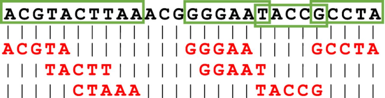 Illustration of sequenced segments. The black text on top shows the reference genome of length 26. The seven sequences in red are reads aligned to the reference. The green boxes highlight the resulting sequenced segments when k = 3. Note that the reads TACCG and GCCTA form two separate segments as the k-mer CGC is not present in K.