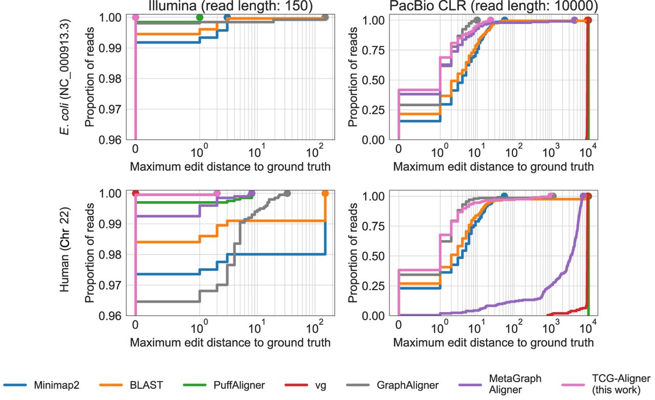 Alignment accuracy on simulated Illumina- and PacBio-type reads (E. coli NC_000913.3 and human Chr 22). The edit distance is measured between the alignment (the returned path in the graph) and the ground-truth sequence. In the top left subplot, the curves of vg- and TCG-Aligner are superimposed.