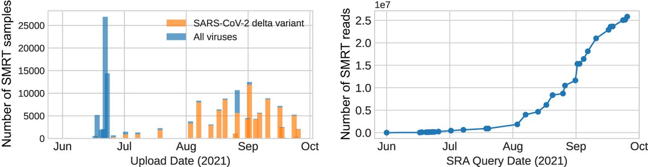 Detection of the delta variants of the SARS-CoV-2 spike protein in SMRT virus sequencing samples deposited on the SRA. (Left) The number of samples detected to contain (orange) and not contain (blue) the SARS-CoV-2 delta variant. (Right) The number of reads containing defining mutations contributed by samples containing the SARS-CoV-2 delta variant.