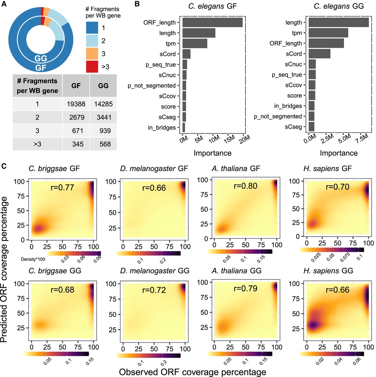 Benchmarking machine-learning-assisted filtering of fragmented transcripts in assemblies. (A) Pie chart and table representing the fragmentation status of the C. elegans GF and the GG transcriptome assembly. Shown are the proportions of WormBase genes overlapping with Trinity assembled transcripts. (B) Bar chart depicts contributions of individual features to the random forest models of GF and GG. A detailed description of features and their sources is provided in Supplemental Table S4. (C) 2D kernel density plots of the observed versus predicted completeness using the GF and GG model established in C. elegans in four other model organisms.