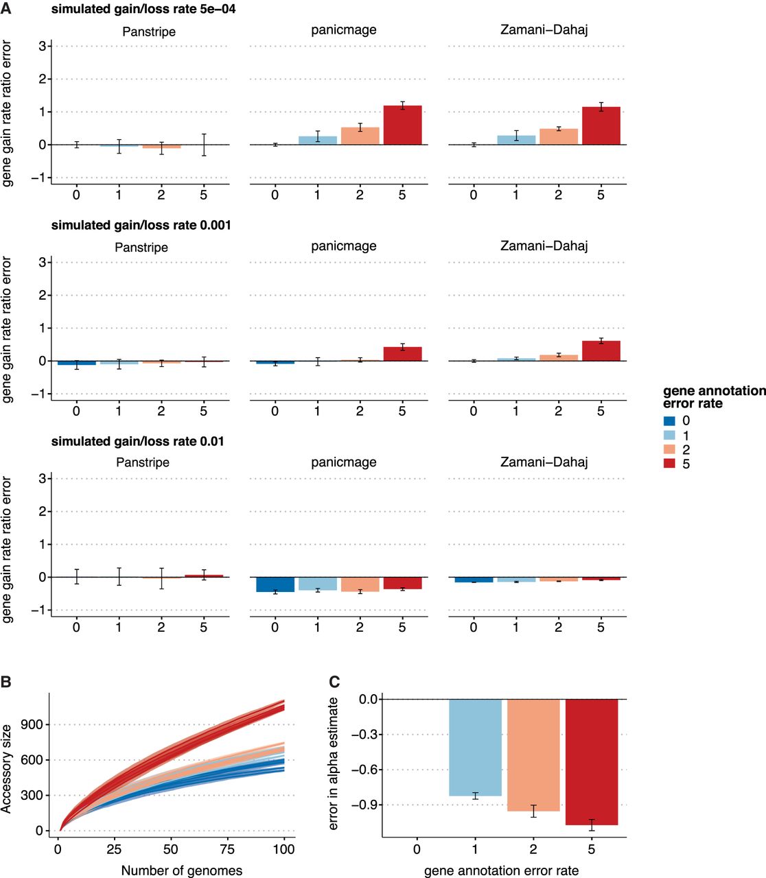 Results of each algorithm on simulated data with different error rates. (A) Bars indicate the mean percentage error in the estimated ratio of gene gain and loss rate compared to the reference rate of 5 × 10−4 with a simulated annotation error of zero. The three rows represent increasingly large gene gain and loss rates of 5 × 10−4, 0.001, and 0.01. The simulated annotation error rates are given along the x-axis. (B) Pangenome accumulation curves with a simulated gene gain and loss rate of 0.001. The colors represent the increasing annotation error rates. (C) The corresponding error in the α parameter estimates after fitting Heaps' law to the curves in B. Lower α estimates indicate a more “open” pangenome. Thus, higher rates of annotation error can lead to incorrect estimates of whether a pangenome is open or closed.