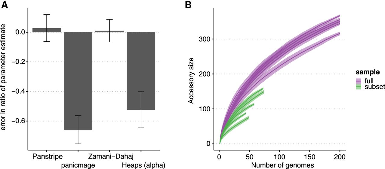 Impact of simulated population structure on each algorithm. (A) Bars indicate the mean percentage error in the estimated ratio of gene gain and loss rate in a smaller subclade of the simulated data compared with estimating the rate on the full simulation. Only Panstripe and the method of Zamani-Dahaj et al. (2016) accurately reported similar parameters in both the small and large sets. This suggests that panicmage and fitting a Heaps' power law are highly sensitive to sampling biases in the data. (B) Similar to the Heaps' power law, pangenome accumulation curves provide misleading differences when comparing the subclade and full data sets.