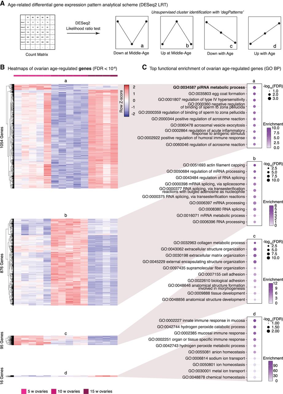 Differential gene expression analysis and GO biological process functional enrichment analysis with ovarian aging. (A) Scheme used for differential gene expression (DGE) analysis. DGE performed with DESeq2 likelihood ratio testing (LRT) revealed four groups of differentially expressed genes corresponding to expression down at middle-age (a), up at middle-age (b), down with age (c), and up with age (d). (B) Heatmaps of gene expression for genes significantly regulated with age in aging killifish ovaries by DESeq2 LRT (FDR < 10−6). (C) Functional enrichment analysis for each gene cluster in B, showing the top 10 significant GO “biological process” terms (FDR < 5%) (for complete list, see Supplemental Table S3A). The most significant term down-regulated in middle-aged ovaries is “piRNA metabolic process” (bolded). (FDR) False-discovery rate, (enrichment) fold enrichment over background.