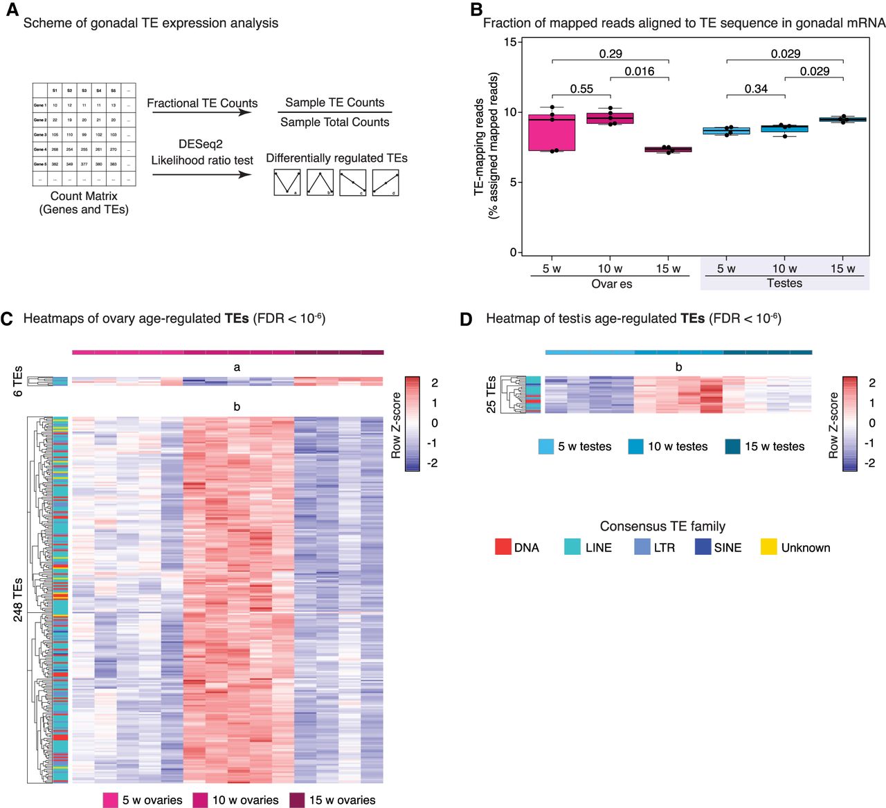 TE expression dynamics in the aging turquoise killifish gonad. (A) Scheme for TE transcriptional analysis in aging gonads. TE DGE was conducted similar to genic DGE analysis (see Methods) and labeled with nomenclature from Figure 2A. (B) Proportion of reads assigned to TEs from each library. Significance in nonparametric Wilcoxon rank-sum test. (C) Heatmaps of mRNA expression for TEs significantly regulated with age in aging killifish ovaries by DESeq2 LRT (FDR < 10−6). TE family color-coded for each row. (D) Heatmaps of mRNA expression for TEs significantly regulated with age in aging killifish testes by DESeq2 LRT (FDR < 10−6).