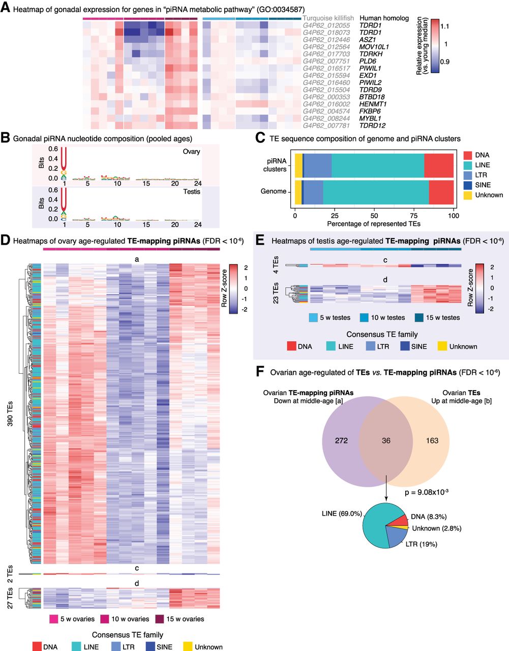 PIWI pathway activity and piRNA abundance characterization in aging turquoise killifish gonads. (A) Heatmaps of normalized gene expression from ovaries and testes with aging in the GO term “piRNA metabolic pathway.” Killifish gene names and their best human homologs are indicated. Rows were normalized by the median expression level in the cognate young gonad to facilitate visualization of age-related changes. (B) Sequence logo plots of piRNA nucleotide composition from ovaries and testes. As expected, killifish piRNAs show a strong 1U bias. Note a slight 10A bias, consistent with active ping-pong biogenesis. (C) Stacked barplots depicting the TE family composition of piRNA clusters and reference genome, as a percentage of identified elements. (D) Heatmaps of TE-targeted piRNA abundance for TEs significantly regulated with age in aging killifish ovaries by DESeq2 LRT (FDR < 10−6). TE family is color-coded for each row. (E) Heatmaps of TE-targeted piRNA abundance for TEs significantly regulated with age in aging killifish testes by DESeq2 LRT (FDR < 10−6). (F) Venn diagram of overlap between TE-mapping piRNAs significantly up-regulated in middle-aged ovaries (pattern a; see D) and TEs significantly down-regulated in middle-aged ovaries (pattern b) (see Fig. 4C). Significance for larger overlap than expected calculated using Fisher's exact test, compared with TEs detected in both analyses. A pie chart of the composition of “consistent” TEs is also reported.
