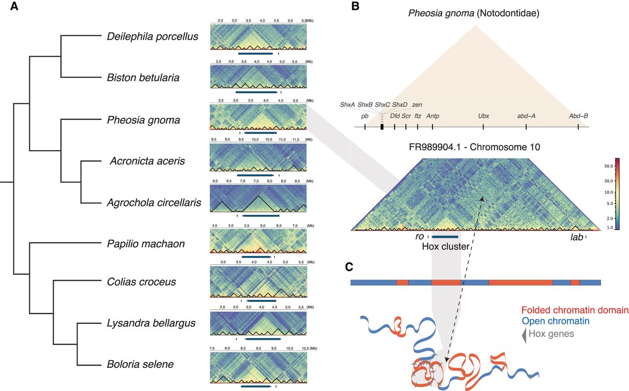 Evidence for a conserved topologically associated domain (TAD) spanning the Hox gene cluster across Lepidoptera. (A) Species tree of nine representative lepidopteran species on left; Hi-C matrix showing 1 Mb either side of the Hox gene cluster (excluding lab). The location of the Hox gene cluster from (Abd-B to pb) is annotated by a blue bar, along with its orientation. The position of ro is annotated with a short vertical black dash. The intensity of chromatin compaction is represented by a blue (low) to red (high) color gradient. Across the core Hox cluster (pb to Abd-B) in each species a TAD is represented by a region of strong contact, by the more-yellow-shaded regions. Black lines represent TADs or sub-TADs predicted by HiCExplorer. (B, top) The arrangement of the Hox gene cluster (excluding ro and lab) surrounded by a TAD (orange) in Pheosia gnoma (lesser swallow prominent). (Bottom) The Hi-C matrix of Chromosome 10 showing the location of the Hox cluster, represented by a blue bar, along with ro and lab, represented by short vertical black dashes. (C) Schematic showing tologically folded domains in Chromosome 10 (red) interspersed by chromosome regions with less consistent topology (blue) based on the above Hi-C matrix. Shaded gray region shows the location of the condensed TAD containing the Hox cluster.