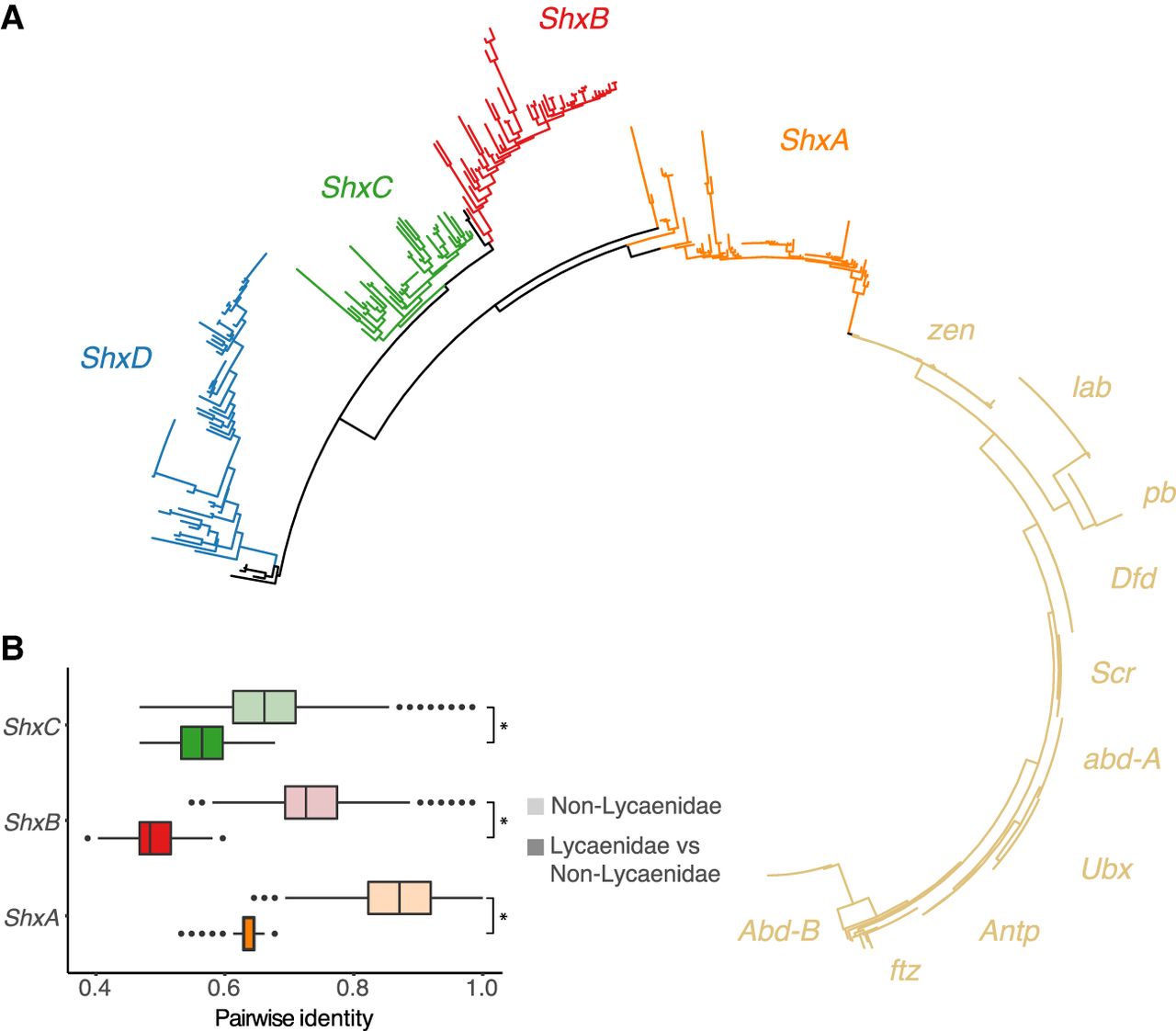 Sequence evolution of Hox genes across Lepidoptera. (A) Phylogenetic tree of Hox and Hox-derived homeodomains across 46 Lepidoptera species. Shx gene clades are colored orange, red, green, and blue; canonical Hox genes are colored yellow. The names of the Hox genes are placed alongside their clade in the tree. (B) Shx genes show elevated sequence evolution following loss of ShxD in Lycaenidae. Results of pairwise identity of Shx genes between Lycaenidae species and non-Lycaenidae species. For each gene (ShxA–C), pairwise identity between Lycaenidae and all other Lepidoptera species with normal Shx gene count (darker shade boxplot) is compared with pairwise identity between all Lepidoptera species with normal Shx gene count (lighter shade boxplot). Each pair of boxplots (light shade and dark shade) are colored according to the color code for each of the Shx genes. Wilcoxon rank-sum test was performed between pairwise identity for Lycaenidae and non-Lycaenidae species: (*) P-value < 0.05.