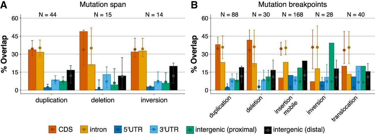 SM genomic distribution. (A) Overlap of SMs with genome annotations. Colored vertical bars represent the overlap between different functional annotations (in colors) and types of SM. The expected overlap was then estimated after the sampling of randomly distributed SMs of the same length, using 1000 replicates. Closed circles represent the median expected overlap of SMs with functional annotations, and error bars represent the corresponding 95% confidence intervals. (B) Distribution of SM breakpoint coordinates (start and end) relative to genomic annotations. The expected overlap of SM breakpoint coordinates with functional annotation was estimated as in panel A, that is, from random sampling of genomic coordinates. Note that the number of observations is twice that in panel A because the mutations have two breakpoints (except for mobile insertions).