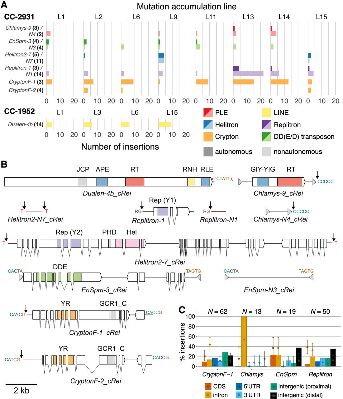 Active TEs. (A) Number of insertions per TE family per MA line. Families with less than two insertions per strain are not shown. TE subclasses are shown in colors (red: PLE; yellow: LINE; blue: Helitron; purple: Replitron; orange: Crypton; green: DD(E/D) transposon). Autonomous (darker colors) and nonautonomous (lighter colors) families putatively relying on the same transposition machinery are grouped. The prefix of each TE name denotes the superfamily. Numbers in parentheses and bold indicate the number of ancestral copies of each TE family. (B) Schematics of active TE families (to scale). Terminal inverted or direct repeats are shown by gray arrows, terminal sequences are shown above the main TE bodies (solid black lines), and insertion targets are shown next to black arrows. Coding sequence and introns of genes are shown by blocks and connecting lines, with domains colored. (RT) reverse transcriptase; (GIY-YIG) GIY-YIG endonuclease; (RNH) Ribonuclease H; (APE) apurinic/apyrimidinic endonuclease-like endonuclease; (RLE) restriction-like endonuclease; (JCP) Josephin-related cysteine protease; (Rep) replication protein (HUH endonuclease); (Hel) helicase; (PHD) plant homeodomain finger; (DDE) DDE transposase; (YR) tyrosine recombinase; (GCR1_C) DNA-binding domain. (C) Distribution of specific TE family insertions relative to genomic annotations in CC-2931. Autonomous and nonautonomous pairs were considered together. Error bars show the expectation based on the random sampling of TE insertions, with 1000 replicates per TE insertion (see Fig. 3). Here, the sampling process was adjusted for the genomic distribution of family-specific target sequences (see panel B).