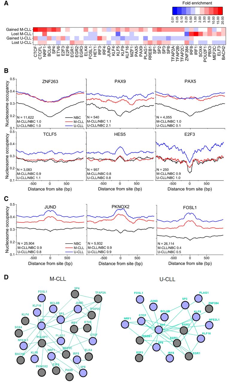 Analysis of TF binding in regions with differential nucleosome occupancy. (A) Heatmap showing fold-enrichment levels for TFs with more than twofold enrichment of their binding sites in regions that lost or gained nucleosomes in M-CLL or U-CLL versus NBCs or significantly changed the shape of their binding profile in CLL. (B) Nucleosome occupancy profiles around binding sites of TFs inside regions that lost ATAC-seq signal in CLL versus NBCs. (C) Nucleosome occupancy profiles around binding sites of TFs inside regions that gained ATAC-seq signal in CLL versus NBCs. The profiles are averaged over all NBC (black), M-CLL (red), and U-CLL (blue) samples. The number of regions (N) and fold expression change of the corresponding TF in two conditions, M-CLL versus NBC and U-CLL versus NBC, are indicated on the graph. (D) Nucleosome repositioning marks distinct TF pathways, which are different between M-CLL and U-CLL, whereas some network features remain common. Green TF connecting lines indicate known relationships of type “controls expression” based on Pathway Commons (http://www.pathwaycommons.org); purple circles, TFs affected both in U-CLL and M-CLL; and gray circles, TFs unique for CLL subtypes.