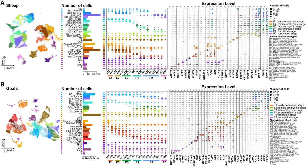 UMAP plots and the number of cell types. Cell number (n > 3) at the 17 time points (middle) and expression levels of representative marker genes shown as violin plots (right) for each cell type in sheep (A) and goat (B) rumen.