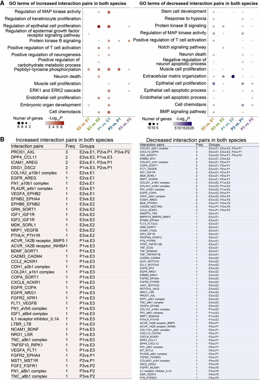 Changes in ligand–receptor (LR) interactions between different cell types in the comparisons of adjacent stages (stages E2 vs. E1, E3 vs. E2, P1 vs. E3, P2 vs. P1, and P3 vs. P2) in sheep and goats. (A) Functional enrichment analysis showing the GO terms for the common up- or down-regulated LR interactions (Padj < 0.05). (B) Common interaction pairs and their frequencies (Freq).