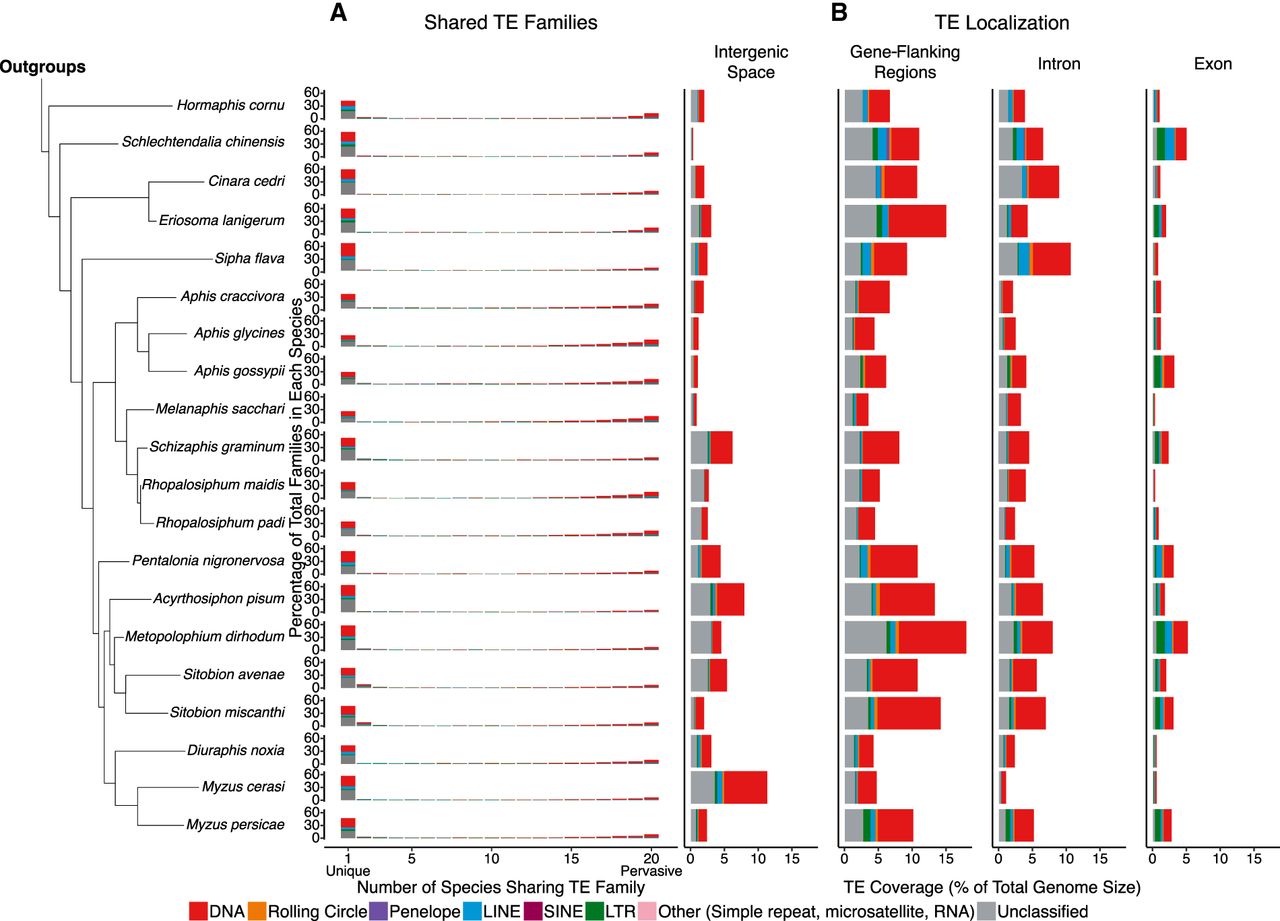 Overview of the extent to which TE families are shared among aphid genomes, as well as their insertion locations. (A) Quantification of shared and unique TE families in aphids. Main TE classifications are represented by the colors indicated in the key. (B) TE genome compartment occupancy, expressed by TEs as a percentage of total genome size. Gene-flanking regions are defined as 20 kb directly upstream of or downstream from the gene body.
