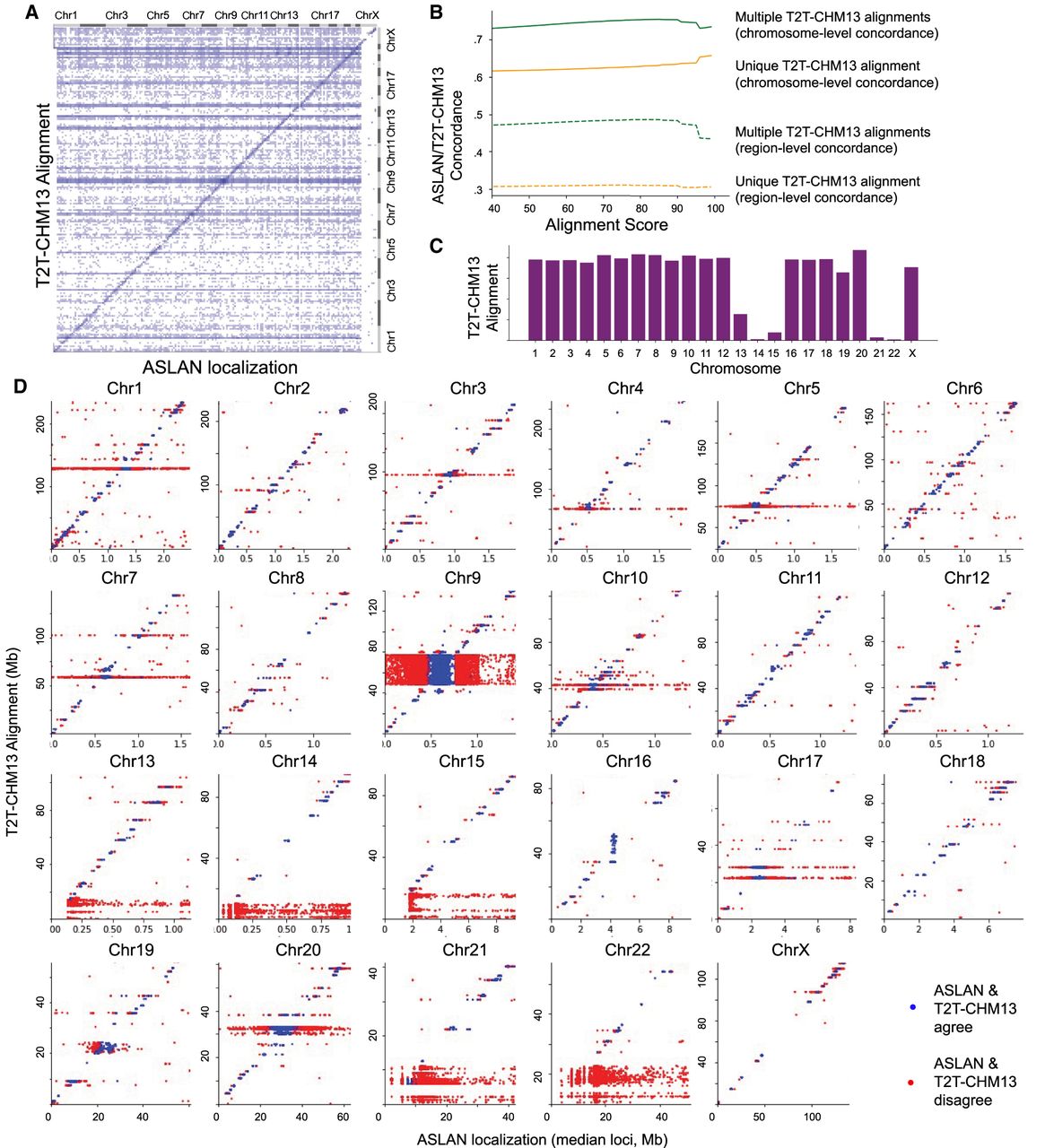 Comparison between ASLAN localizations and T2T-CHM13 alignments. (A) Confusion matrix comparing ASLAN localizations, lifted over to T2T-CHM13 coordinates to T2T-CHM13 alignments of 100-mers extracted from the unmapped reads, binned into 1000 equally sized bins across the genome. (B) Concordance rate between ASLAN localization and T2T-CHM13 alignment versus alignment score, colored by whether or not alignment to T2T-CHM13 was a unique mapping or not. (C) Concordance rate between ASLAN localization and T2T-CHM13 alignment, versus the chromosome to which ASLAN localized. Acrocentric Chromosomes 13–15 and 21–22 show a significantly lower concordance. (D) T2T-CHM13 alignment versus center point of ASLAN localization region, separated by chromosome and colored by whether or not T2T-CHM13 alignment and ASLAN localization were in concordance.