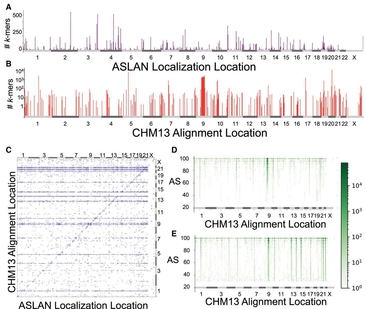 Characterizing nonconcordance between ASLAN localizations and CHM13 alignments and potential hotspots of genetic diversity. (A) Distribution of reads that failed to align to the T2T-CHM13 assembly but that were successfully localized via ASLAN. (B) Distribution of reads for which the localization region predicted by ASLAN contained the location the read aligned to on T2T-CHM13 but for which the T2T-CHM13 alignment score was less than 90. These regions may indicate new hotspots for genetic diversity. (C) Joint-plot of regions where ASLAN localization and T2T-CHM13 alignments were in disagreement with one another and where the T2T-CHM13 alignment score was less than 90. These may indicate sequences that are not represented in the T2T-CHM13 but that are somewhat homologous to a different region in T2T-CHM13 and may be mismapped. (D,E) Loci and alignment score distribution between the T2T-CHM13 alignments for k-mers with ASLAN localizations in agreement with each other (D) and in disagreement with each other (E). We see that k-mers in disagreement have significantly lower alignment scores, suggesting that imperfect alignments to T2T-CHM13 may actually be originating from a human genome sequence not well represented on T2T-CHM13.