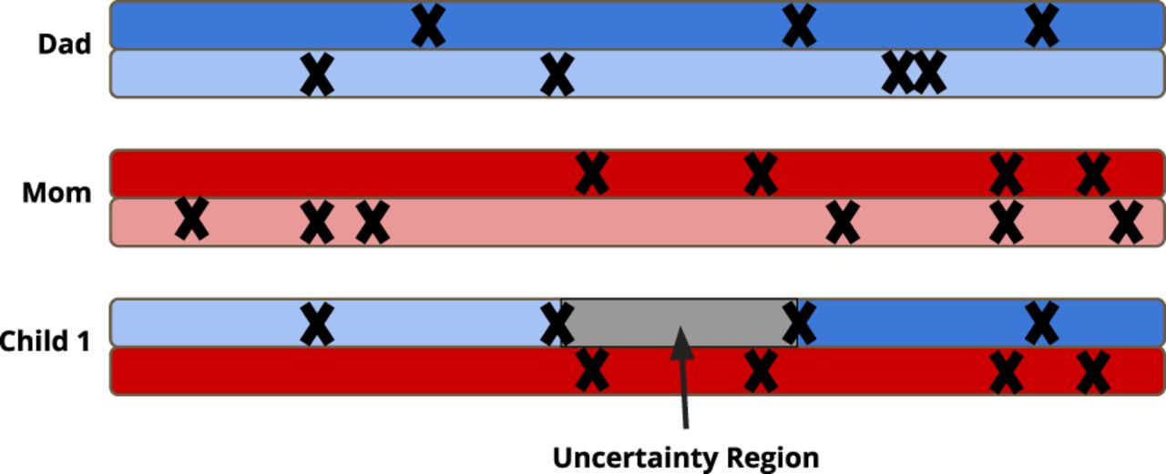Uncertainty regions. Because of long stretches of homozygosity in families, it may be difficult to determine exactly where a crossover event occurs.