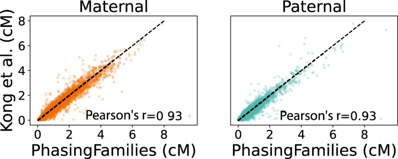 Comparison of recombination rates. We used our crossovers to produce recombination rate maps for 1-Mbp bins across the genome. PhasingFamilies produced recombination rates that correlate well with previously published (Kong et al. 2010) recombination maps.