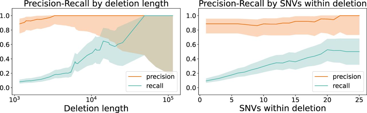Precision and recall of inherited deletions for HG002. Inherited deletions detected by PhasingFamilies show high precision, with recall dependent on the length of the deletion. As deletion length increases, recall increases from 0.082 to 1.0, as shown in the left panel. Recall also improves with more SNVs within the deleted region, as shown in the right panel. Shaded regions indicate the Agresti–Coull binomial confidence interval.