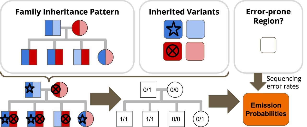 HMM emission probabilities. Emission probabilities represent the probability of observing a set of family variant calls given that we are in a particular state. To estimate these probabilities, we first use the family inheritance pattern and the inherited variants to calculate the expected genotypes for the family. We then use the error-prone region flag to determine which set of variant calling error rates to use for the state. Finally, we calculate the emission probabilities for the state.