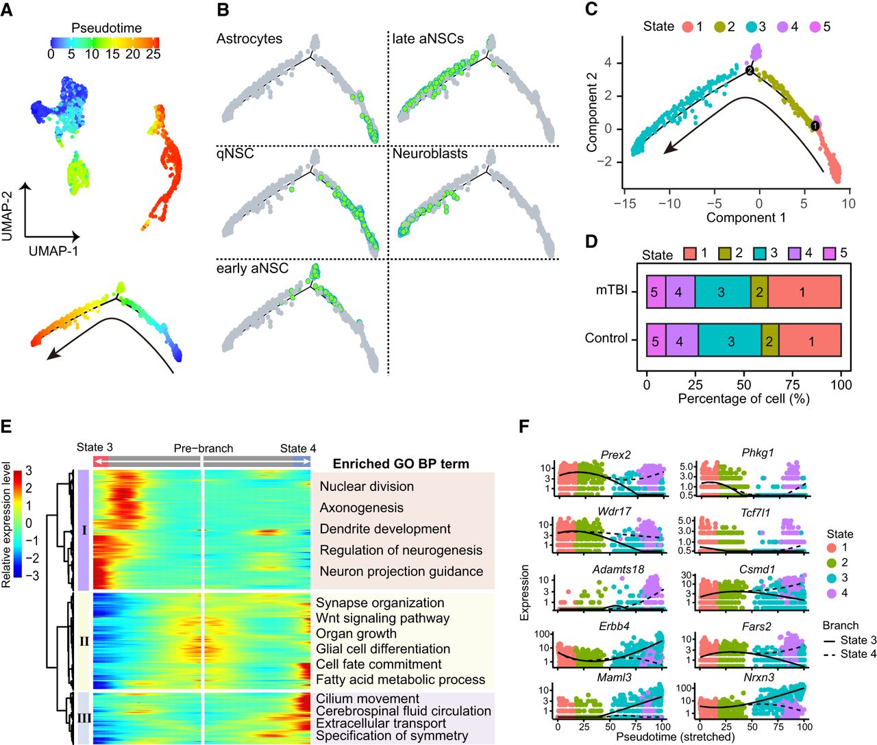 Pseudotime analysis reveals reprogramming trajectory of NSCs after injury. (A, top) Colored cells plotted onto the UMAP according to the pseudotime. (Bottom) Monocle2-generated pseudotemporal trajectory of NSCs & astrocytes. (B) Different astrocyte & NSC subtypes along the pseudotime trajectory. (C) Cell ordering from different differentiation stages along the pseudotime trajectory. (D) Bar plot showing the proportion of each differentiation stage in the control and the mTBI. (E, left) Heat map showing gene expression patterns along the pseudotime (1000 genes). (Right) Three clusters were identified based on the expression dynamics; the GO term for each cluster was displayed on the right column. (F) Expression pattern of representative genes during differentiation from aNSCs to neuroblasts. States are shown in colors, and branches are indicated by lines.