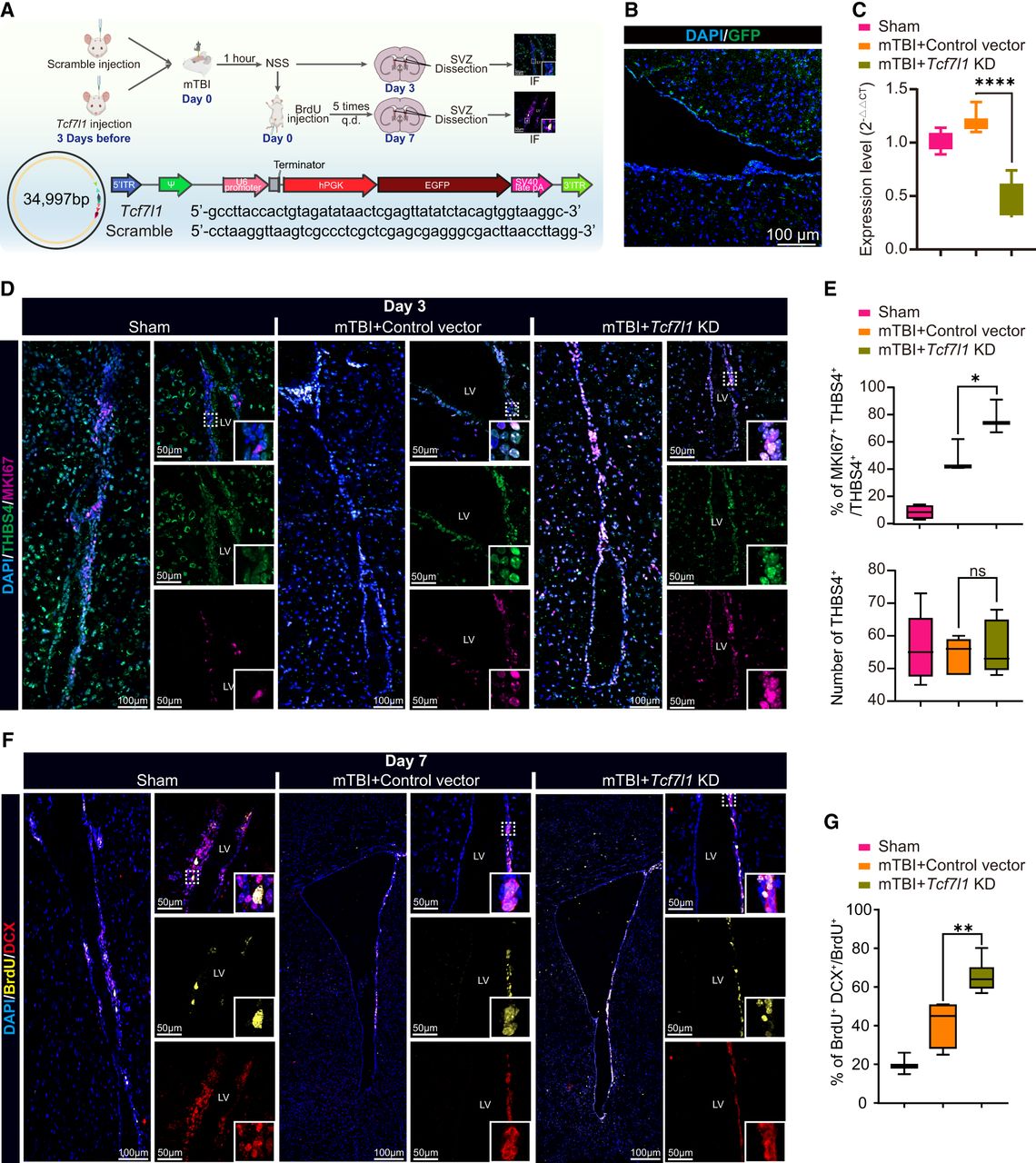 Suppressing Tcf7l1 promotes neuronal differentiation of the SVZ NSCs after mTBI. (A, top) Schematic diagram of in vivo experiment. (Bottom) Schematic representing the adenovirus injection, along with its genetic sequence. (B) GFP signal indicating successful SVZ injection of the adenovirus. (C) qPCR assay of Tcf7l1 indicating successful knockdown of Tcf7l1 in the SVZ. Expression levels were normalized to Gapdh. Three technical duplicates were performed in individual qPCR experiments. (D,E) Immunofluorescence staining (D) and THBS4+MKI67+/THBS4+ cell counting results (E) for THBS4 and MKI67 in the SVZ region from the sham, mTBI + control vector, and mTBI + Tcf7l1 vector. Tissues are counterstained with DAPI. The t-test was used to determine statistical significance: (*) P ≤ 0.05. (F,G) Immunofluorescence staining (F) and DCX+BrdU+/BrdU+ cell counting results (G) for DCX and BrdU in the SVZ region from the sham, mTBI + control vector, and mTBI + Tcf7l1 vector. Tissues are counter-stained with DAPI. The t-test was used to determine statistical significance: (**) P ≤ 0.01.