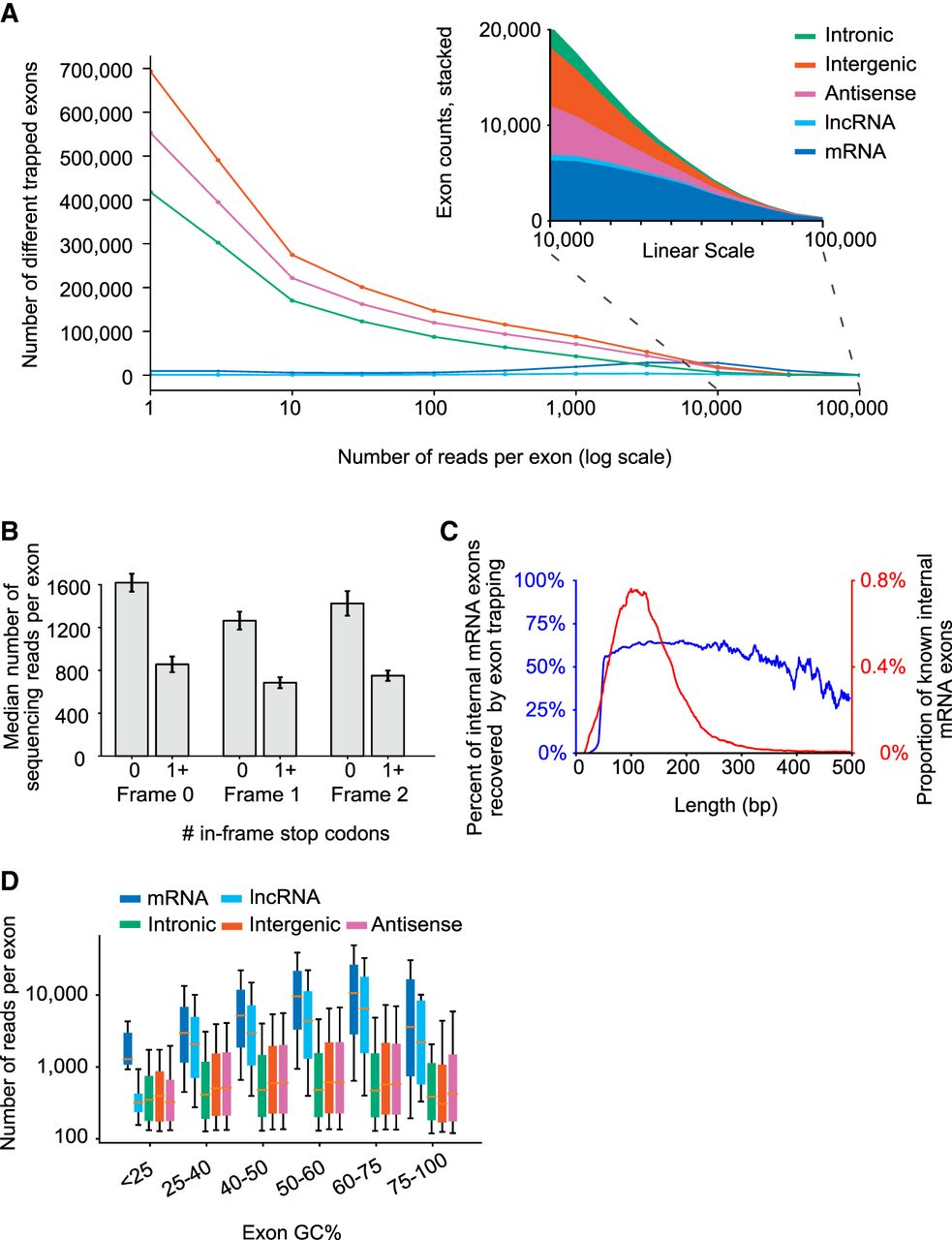 Properties of trapped exons. (A) Histograms of sequencing read counts for trapped internal exons within different genomic regions. Outset plot shows logarithmic exon counts and inset shows zoomed linear exon counts. Logarithmic bin boundaries indicated by dots corresponding to 10x for x from 0 to 5 with step size 0.5. Linear bin boundaries range from 100 to 100,000 with a step size of 1000. (B) Bar plots depicting sequencing read counts of internal exons containing zero or at least one in-frame stop codon. Results for reading frames in the first (“Frame 0”), second (“Frame 1”), and third (“Frame 2”) positions are shown. (C) Line plots depicting the distribution of mRNA exon lengths and the percent of mRNA exons at each length recovered by exon trapping. Plots have a 9 bp smoothing window applied. (D) Boxplots depicting GC content of trapped internal exons from different genomic regions. y-axis indicates sequencing read counts of trapped exons, within indicated GC content ranges (x-axis). Whiskers indicate 10th and 90th percentiles.