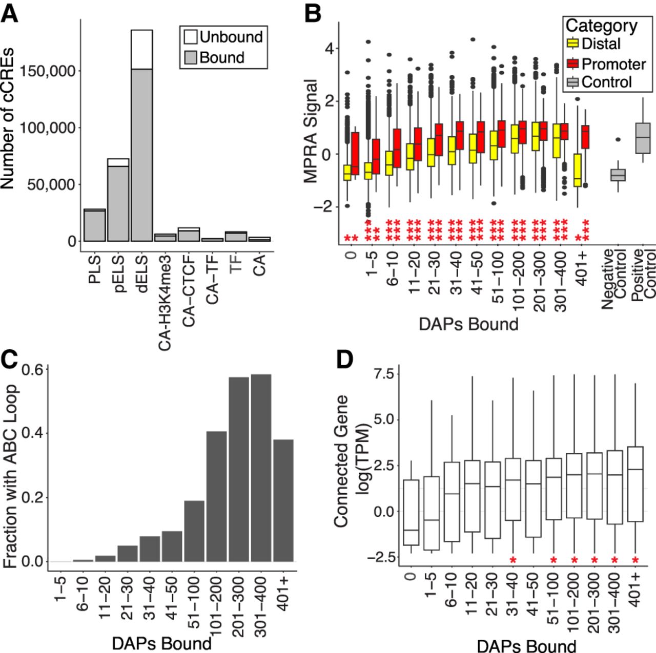 Genomic properties and activities of DAP-bound regions in genomic and reporter contexts. (A) The majority of cCREs of each type are bound by an assayed DAP. Bars show the number of sites of each cCRE class (x-axis) with at least one DAP association (“bound”) and those with none in our data set (“unbound”) when restricted to those overlapping with an ATAC-seq peak in HepG2. (PLS) Promoter-like signature, (pELS) proximal enhancer-like signature, (dELS) distal enhancer-like signature, (CA-H3K4me3) chromatin-accessible H3K4me3 region, (CA-CTCF) chromatin-accessible CTCF-bound region, (CA-TF) chromatin-accessible TF-bound region, (TF) TF-bound region lacking chromatin accessibility, and (CA) chromatin accessibility only. (B) Promoter elements from locally performed lentiMPRA experiments require fewer DAPs binding for high activity in lentiMPRA than do distal elements. Boxes show MPRA signal (natural log of normalized RNA reads over normalized DNA reads) of promoter elements as a function of binned number of DAPs (x-axis) with a peak in the genomic region. Promoters are defined as elements whose bounds overlapped with a 200-bp region centered on GENCODE TSSs. Distal elements are defined as elements at least 5 kb from annotated TSSs. Positive and negative control elements are plotted for comparison. In B and D, boxes represent 25%–75% quartiles with lines indicating the median, whiskers extend to ±1.5 × IQR (interquartile range) past the boxes, and when present, points are observations falling outside of this range. Unpaired t-tests were used to identify significant differences in the means between distal and promoter element activity in each category. (*) P = 0.05, (**) P = 0.0001, (***) P ≤ 2.2 × 10−16. (C) The fraction of distal loci with an ABC connection as a function of binned number of DAPs at a distal element. (D) Expression of genes genome-wide increases as the number of factors bound and connected distal elements increases. The y-axis indicates the natural log expression distribution of the ABC-supported gene as a function of binned number of DAPs at a distal element. Unpaired t-tests were used to identify significant differences in the means between the expression of a given category compared with expression in the zero category. (*) P = 0.05.
