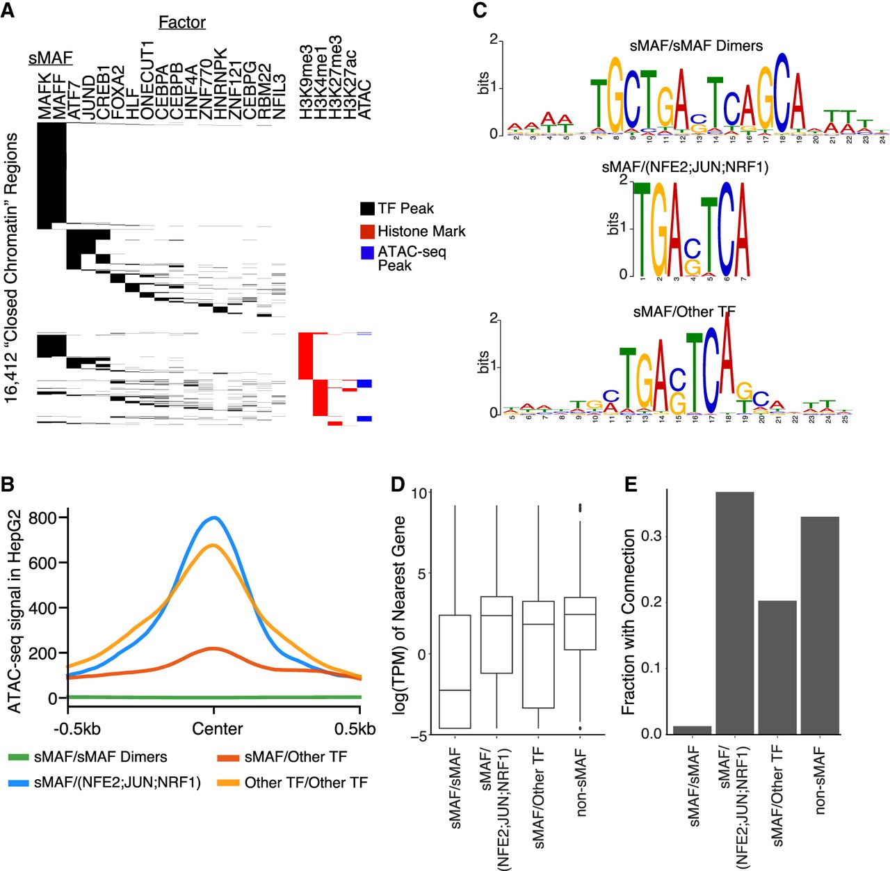 Small MAF (sMAF) proteins bind widely to non-cCRE regions in a sequence-directed manner and show widespread influence on nearby gene expression. (A) Heat map of non-cCRE regions with binding of various TF and histone marks. MAFF and MAFK show the largest degree of binding of any such mark. (B) ATAC-seq signal (y-axis) at regions bound by various TF dimer sets ±500 bp (x-axis). sMAF/sMAF (green) dimers show markedly lower ATAC-seq signal compared with other groups, and sMAF heterodimers with known activating cofactors (blue) show high openness. sMAF heterodimers with noncofactors (red) show minimal openness, and heterodimers made of other TFs (orange) show high but broad openness. (C) Motifs generated via MEME using regions bound by noted dimer sets. sMAF/sMAF dimers (top) show more flanking structure outside of the core MAF motif than do heterodimers of sMAF and non-sMAF proteins. (D) Box plot shows the distribution of natural log of expression levels as measured by TPM (y-axis) for genes closest to each putative dimer set (x-axis). Putative sMAF/sMAF dimers show much lower expression profiles than do other groups. Boxes represent 25%–75% quartiles with line indicating median, whiskers extend to ±1.5 × IQR (interquartile range) past the boxes, and points are observations falling outside of this range. (E) Bars show the fraction (y-axis) of putative dimer sets (x-axis) that have evidence for binding in a looped region, based on Hi-C data. sMAF/sMAF dimers show a significantly lower rate of binding in looped regions than do other dimer types.