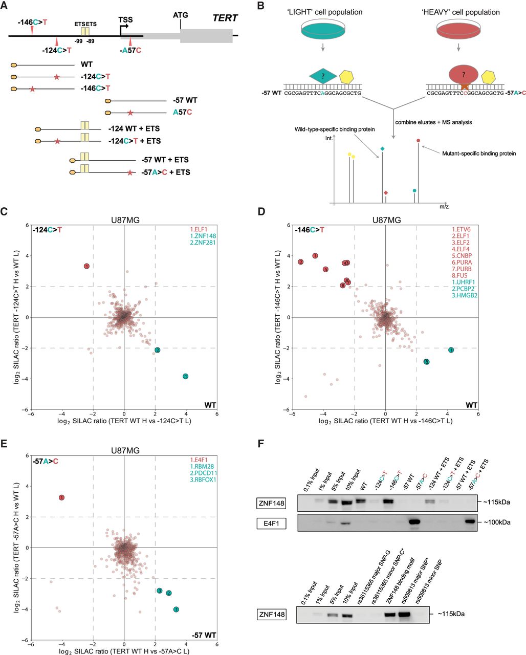 ZNF148 and E4F1 bind to WT and −57A > C TERT promoter sequence in vitro. (A) Schematic showing the coverage of the TERT promoter sequence by the DNA probes used in this study. (B) Workflow for a quantitative SILAC-based protein–DNA interaction screen. Biotinylated concatenated DNA oligonucleotides from A were immobilized on magnetic streptavidin beads, and bound proteins were detected by MS or western blot. −57WT and −57A > C probes are shown as an example of WT and mutant sequences. Specific protein binders display a differential SILAC ratio, with background binders showing a 1:1 ratio. (C) Two-dimensional interaction plot for WT versus −124C > T using SILAC-labeled U87MG nuclear protein extracts. Mutant-specific binders are labeled in red, and WT-specific binders are labeled in green. (D) Two-dimensional interaction plot for WT versus −146C > T. Mutant- and WT-specific binders are labeled similar to those in C. (E) Two-dimensional interaction plot for WT versus −57A > C. Mutant- and WT-specific binders are labeled similar to those in C. (F) Sequence specific pull-down of endogenous ZNF148 and E4F1 with HeLa nuclear extracts using the nine probes shown in A, top. Sequence-specific pull-down of endogenous ZNF148 with HeLa nuclear extracts with probes for rs36115365 major SNP-G and minor SNP-C, rs509813 major and minor SNP, and CDKN1A promoter (containing ZNF148 binding site) probes (bottom). Please note the occurrence of a double band for endogenous ZNF148, which may be owing to isoforms and/or post-translational modifications.
