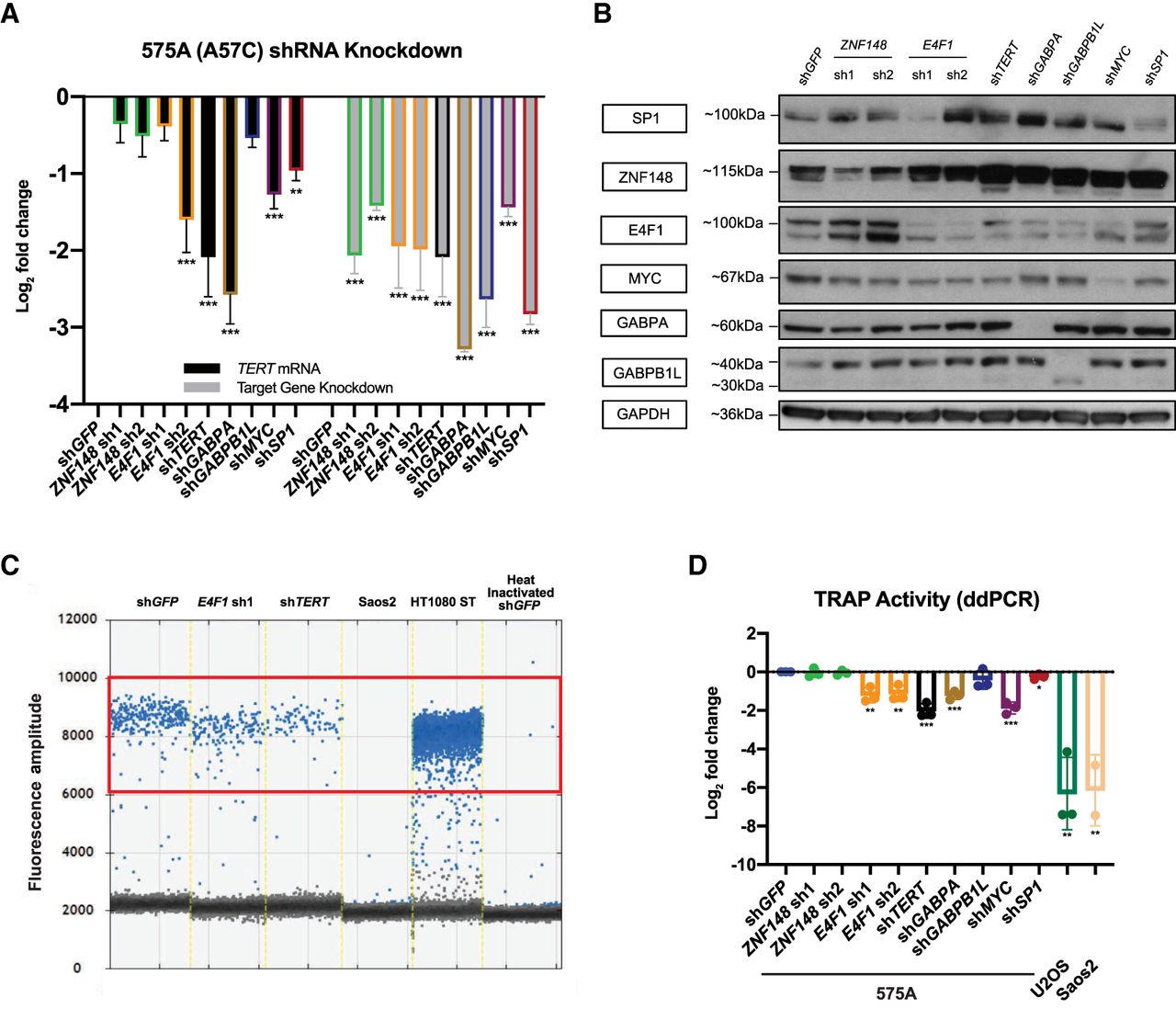 E4F1 knockdown leads to reduction of TERT promoter transcription and telomerase activity in 575A cells. (A) mRNA expression data of TERT and target genes following 48 + 72 h (48-h virus transduction, 72-h puromycin selection) post-shRNA knockdown in 575A, with shGFP as control. Data shown as mean of values from three biological replicates. (B) Representative western blot image following 48 + 72 h post-shRNA knockdown in 575A, with shGFP as control. (C) ddPCR-TRAP assay measuring telomerase activity following 48 + 72 h post-shRNA knockdown in 575A, with shGFP as control. Telomerase-negative U2OS and Saos2 were used as negative controls. Positive droplets quantified are labeled in blue. (D) Quantification of data in C; data shown as mean of values from three biological replicates. All statistical significance was calculated using a two-sampled t-test, and the degree of significance is indicated as follows: (*) P < 0.05, (**) P < 0.01, (***) P < 0.001.