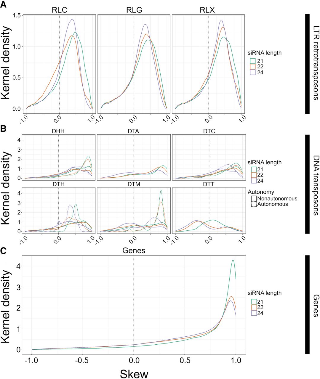 The distribution of skew for smRNA mapping in different feature categories. Skew is presented on the x-axis. Height on the y-axis represents the Gaussian-estimated kernel density of skew values. Skew measures the relative enrichments of smRNAs in miRNA-like regions compared with non-miRNA regions and ranges from 1.0 (enrichment in miRNA-like regions) to −1.0 (enrichment in non-miRNA-like regions). All panels use the same x-axis. The dotted vertical line represents zero, where smRNA density is not skewed to either low- or highMFE regions. (A) Skew for retrotransposons for 21-, 22-, and 24-nt smRNAs, separately for Copia (RLC), Ty3 (RLG), and unknown retrotransposons (RLX). (B) Skew for DNA transposons, with names for the three letter codes provided in Table 2. The dashed lines represent skew for putatively autonomous elements, and solid lines represent nonautonomous elements. (C) Skew measured in genes. These graphs are based on LP-hairpins but are analogous for lowMFE regions, and all feature categories are presented in Supplemental Figure S7.