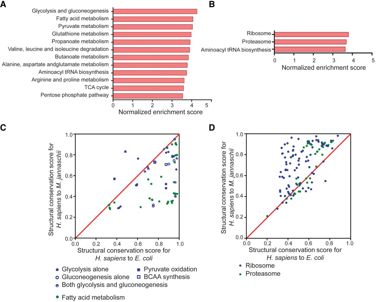 Global comparison of the structures between distantly related species indicates that structurally conserved genes are enriched in specific pathways. (A,B) Gene set enrichment analysis for all protein-coding genes in the human genome with structural conservation scores for H. sapiens to E. coli (A) and H. sapiens to M. jannaschii (B) used as ranking metrics. The built-in KEGG pathway gene sets were used to evaluate the enriched gene set. The bar charts show significantly enriched gene sets with normalized enrichment scores over 3.5. The enrichment analysis reveals the likelihood of the genes in the indicated gene set being ranked at the top of the ranked list based on structural similarity. (C,D) Comparison of the structural conservation scores for H. sapiens to E. coli and H. sapiens to M. jannaschii of protein-coding genes in selected gene sets. Points above the diagonal indicate that the conservation score on the y-axis is better than that on the x-axis. Part C corresponds to the gene sets enriched in the conserved genes for H. sapiens to E. coli. Part D corresponds to gene sets enriched in the conserved genes for H. sapiens to M. jannaschii. For the lists of genes in the gene sets, see Supplemental Table S5.
