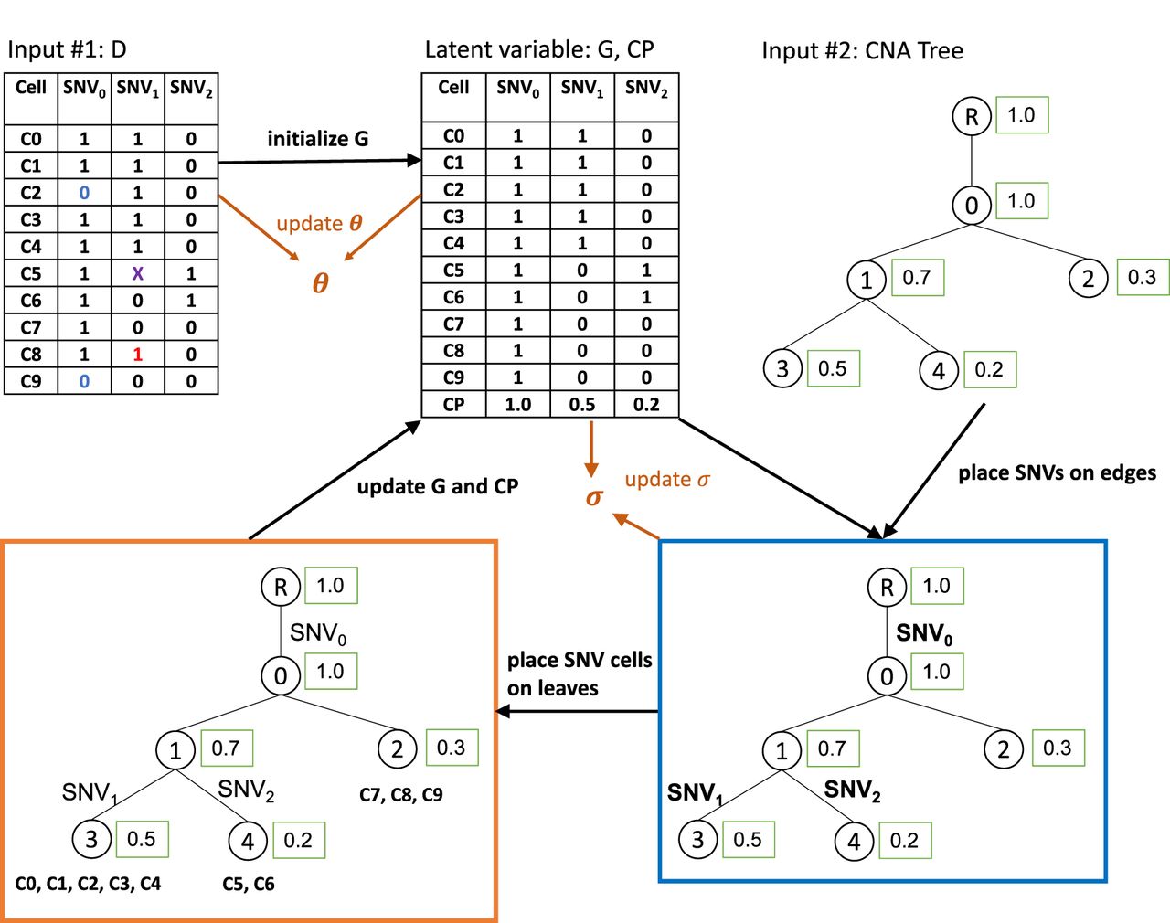 Illustration of SCsnvcna method. Inputs are observed data D (a cell-by-SNV matrix) and a CNA tree. Observed data may have FP SNVs (red 1s), FN SNVs (blue 0s), and missing entries (X). The underlying genotype matrix G along with the CP is initialized based on D. SCsnvcna places SNVs on the edges of the CNA tree (blue box) and SNV cells on the leaves of the CNA tree (orange box), followed by the update of the latent variables, which are G, the error rates θ, and the standard deviation of the CP difference between CNA cells and SNV cells (σ). The output of SCsnvcna is the placement of SNVs and cells on the CNA tree and the predicted values of G, θ, and σ.