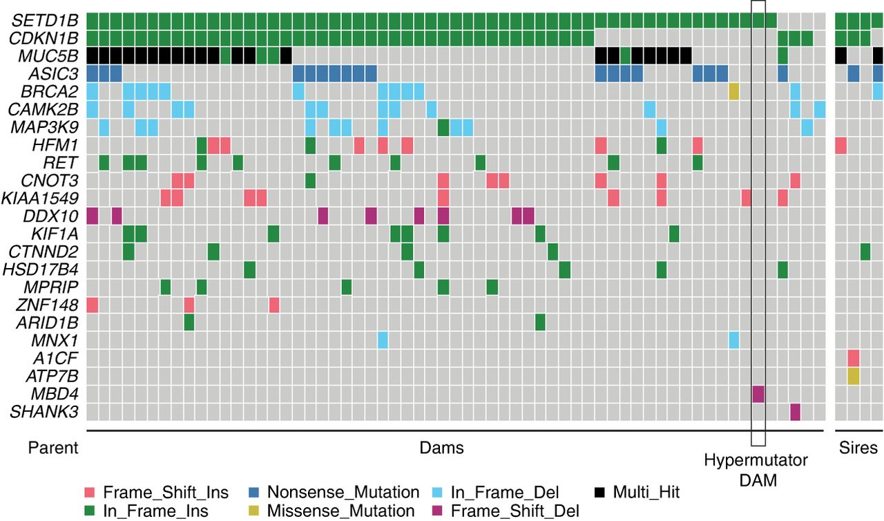 MBD4 is the only mutated DNA repair gene private to 26537. To confirm MBD4 is the most likely candidate for the hypermutation phenotype, we searched for biallelic damaging mutations across 1381 candidate genes for germline hypermutation derived from the literature (Supplemental Table S3). We identified candidate mutations in 23 genes, shown here. MBD4 was the only gene specifically mutated in 26537 and not other parents in the study.