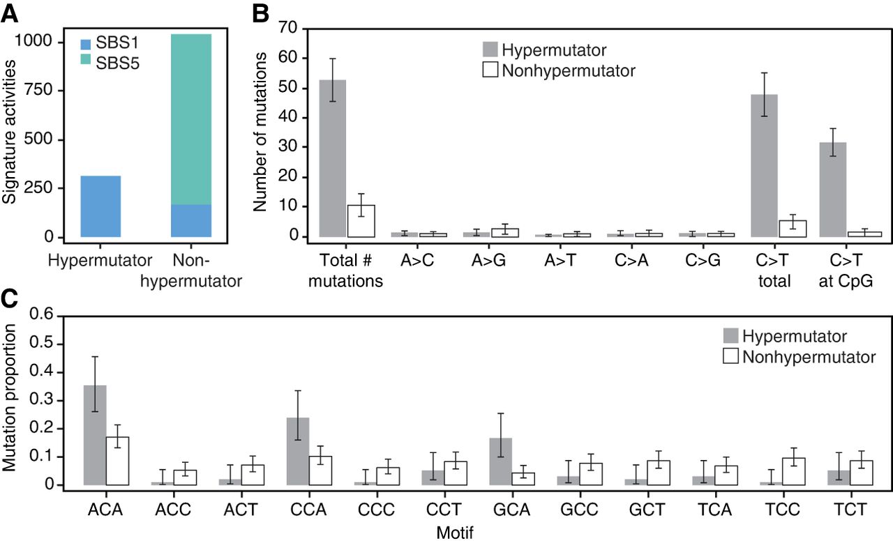 Mutation signature analysis of MBD4 germline mutations. (A) Unlike germline mutational signatures in control individuals, which are mostly signature 5 with a smaller proportion of signature 1, the majority of mutations in the hypermutated offspring were attributed to signature 1 with very small contribution from signature 5. (B) Of the six possible substitution types, C > T was the only based substitution with a significant excess in offspring of 26537 (hypermutator) compared with offspring from the control families (nonhypermutator). Most of these C > T changes were in a CpG context, consistent with the known function of MBD4 in repairing spontaneous methyl-cytosine deamination. (C) The remaining excess of C > T changes were observed at CpA positions (P = 3 × 10−4 for contrast of hypermutator vs. control by Poisson regression).