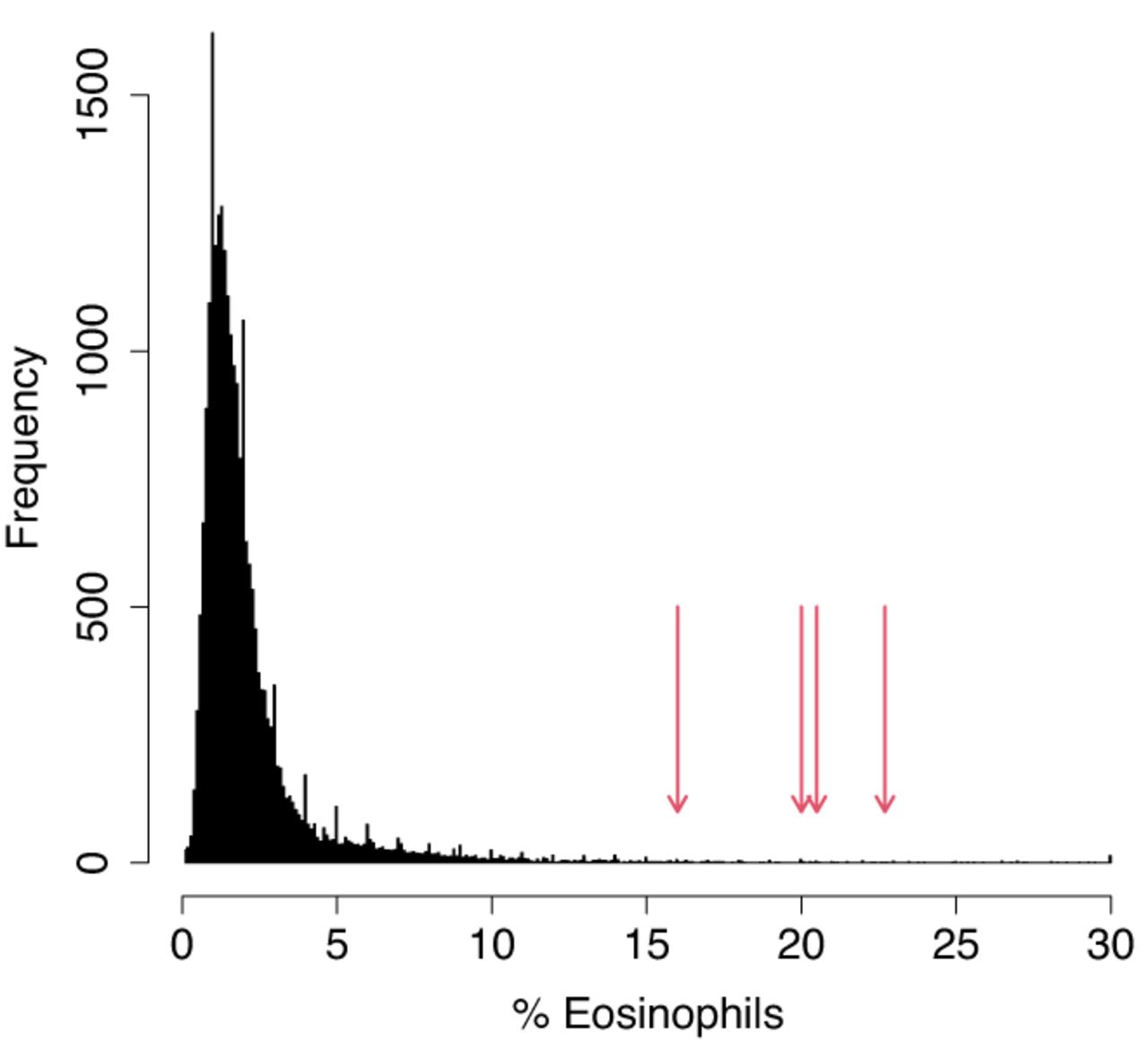 Rhesus macaque 26537 showed sustained eosinophilia at age 14. Four independent CBCs run over several weeks showed 16%–22.7% eosinophils (red arrows). These numbers were in the top 0.5% of more than 25,000 CBCs run at ONPRC since 2016 (histogram).